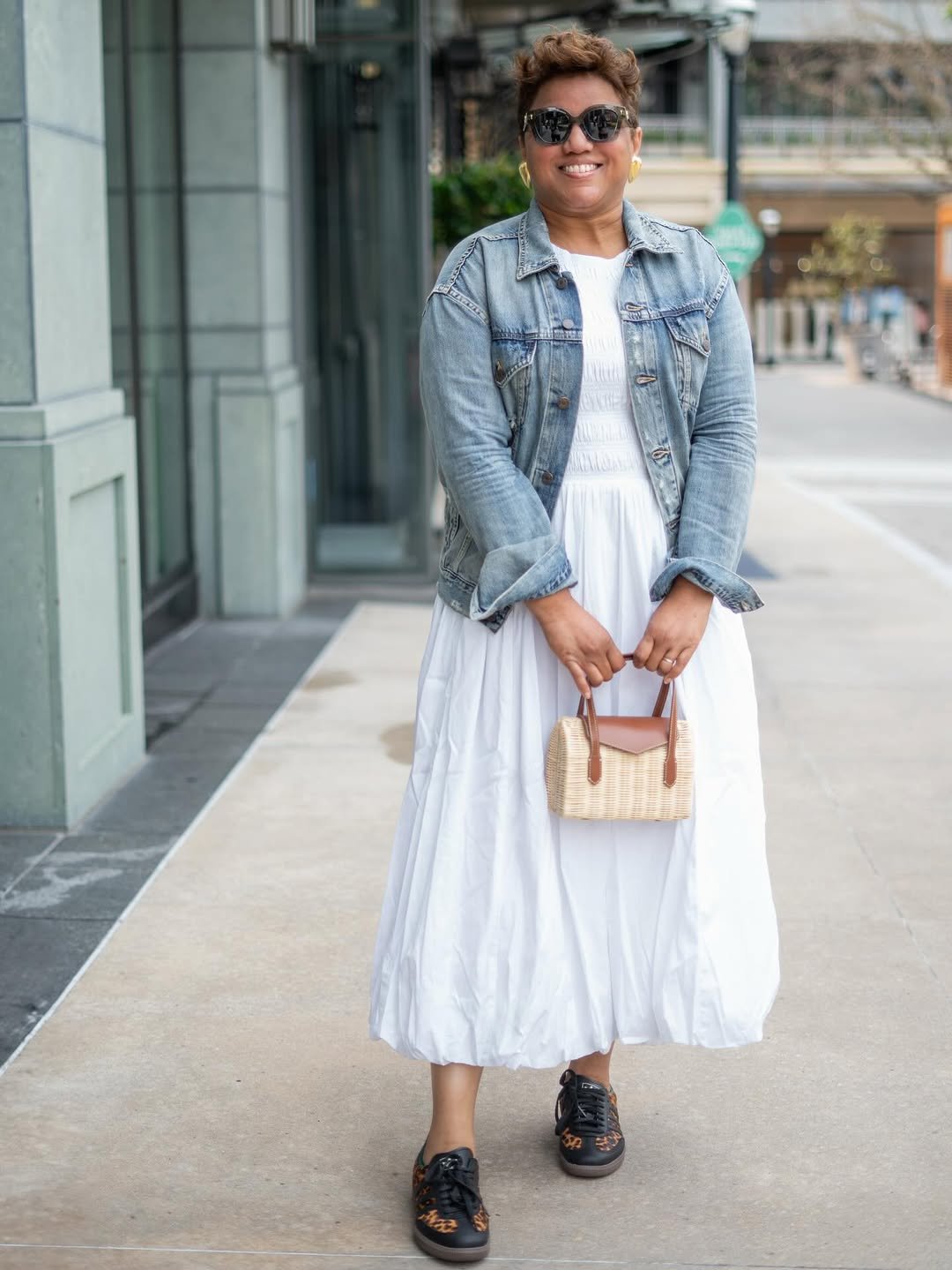 A classic light-wash denim jacket over a floaty white midi dress is already timeless. But paired with leopard sneakers and a structured mini bag? That’s personality.