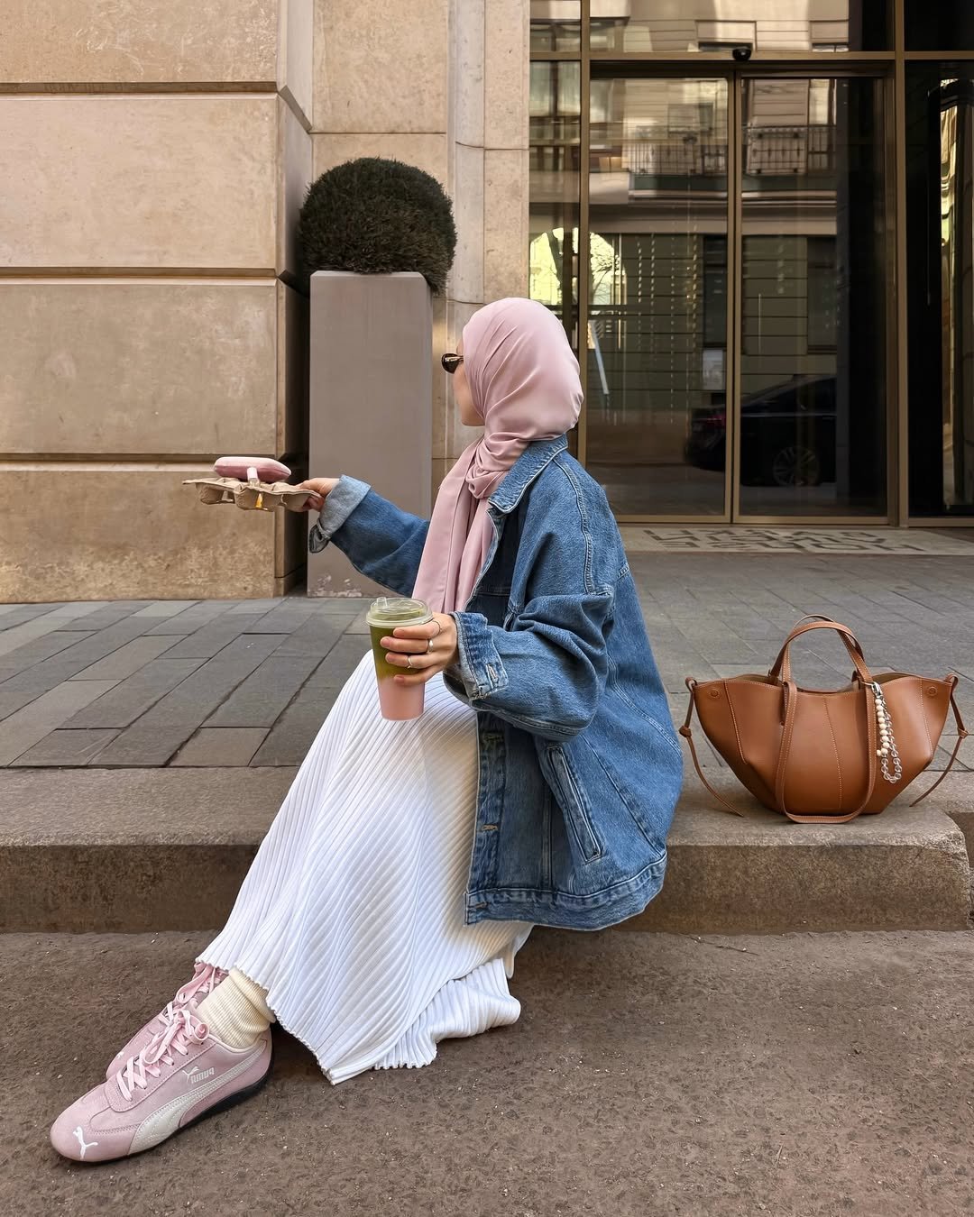 An oversized denim jacket paired with a pleated white skirt and blush sneakers? That’s how you do modest-meets-modern without losing an ounce of cool. The soft pink hijab ties everything together so seamlessly, it feels intentional down to the last detail.