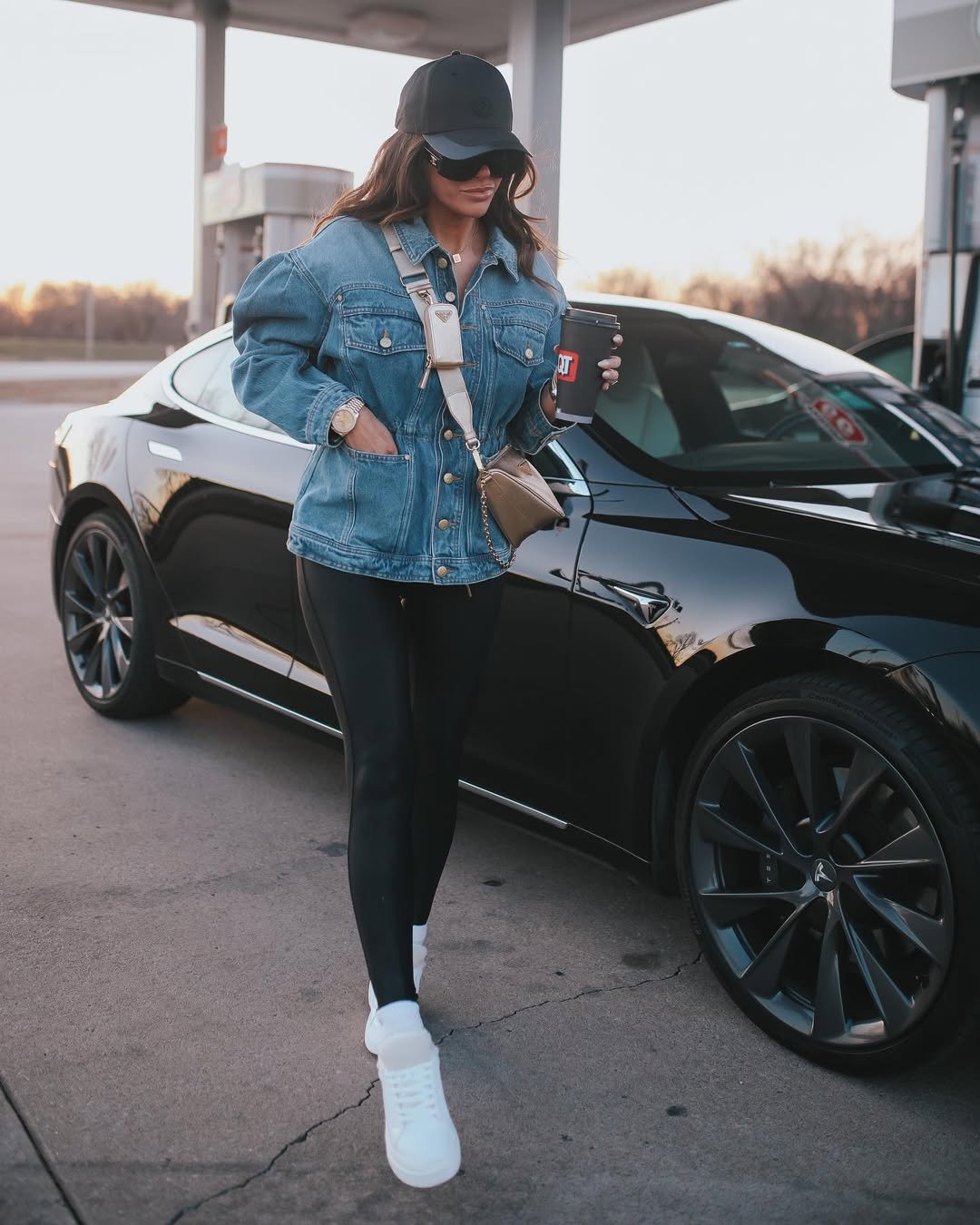 This puff-sleeve denim jacket over sleek black leggings is the definition of elevated athleisure. The baseball cap and crossbody keep it practical, but the silhouette still feels intentional.