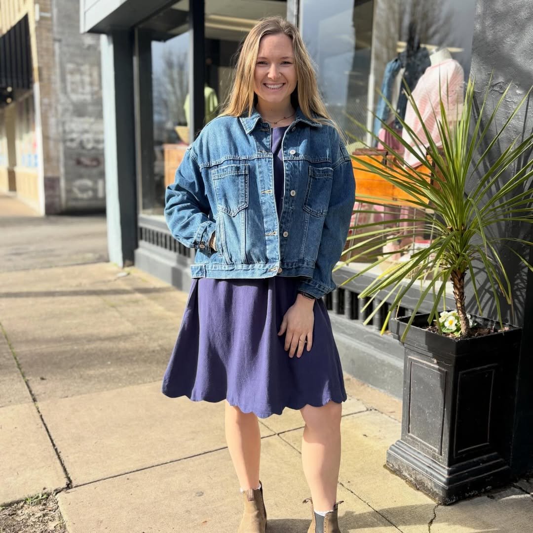 A classic denim jacket over a soft, flowy dress is one of those combos that never misses. The proportions are easy, the vibe is approachable, and those ankle boots add just the right touch of polish.