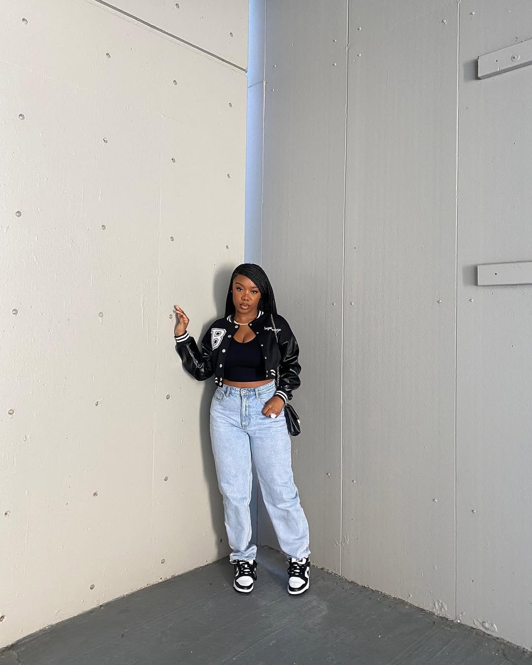 Black cropped top, relaxed light-wash jeans, and a statement varsity jacket? This one has attitude. The high-top sneakers seal the deal with that throwback, sporty edge.