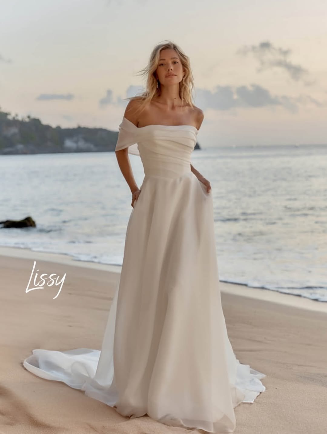 An off-shoulder gown that feels like a sigh of ocean air — soft, flowing, and utterly timeless. The draped bodice adds structure without stiffness, while the skirt sways naturally with each step along the shoreline.