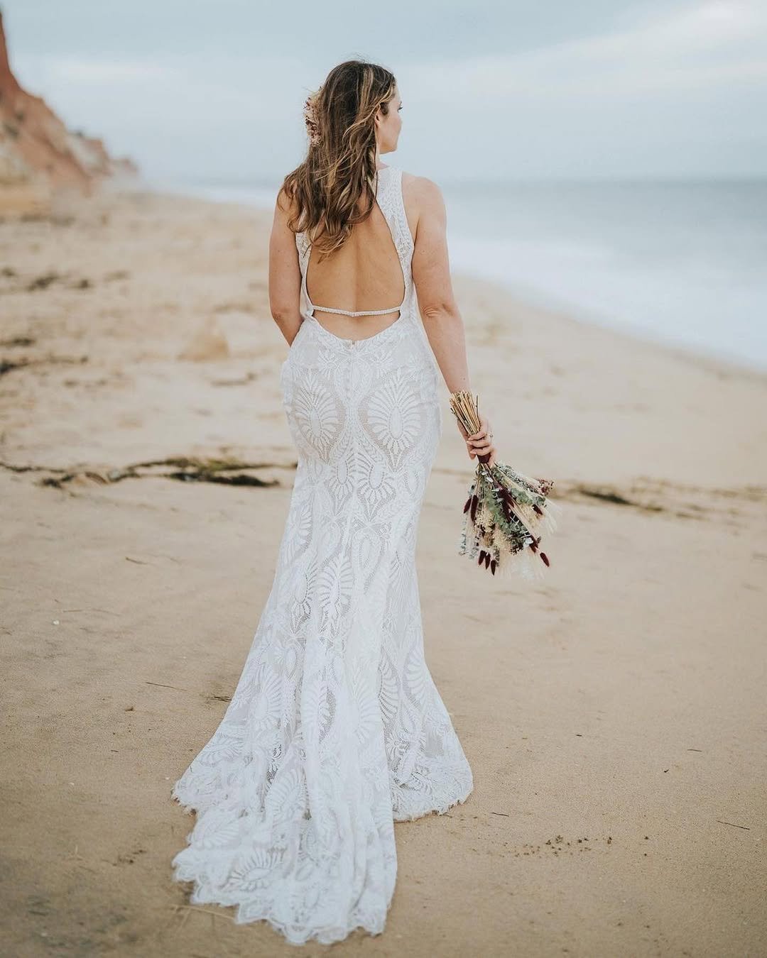 Barefoot on the sand, wind in her hair, this bride embodies the spirit of laid-back romance. The open back and geometric lace patterns give the gown a free-spirited charm that’s perfect for coastal vows.