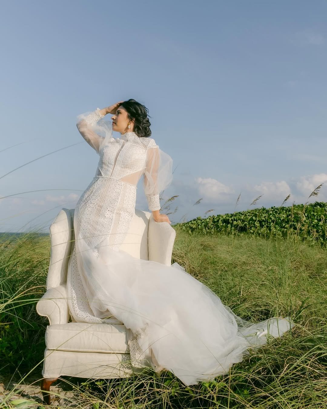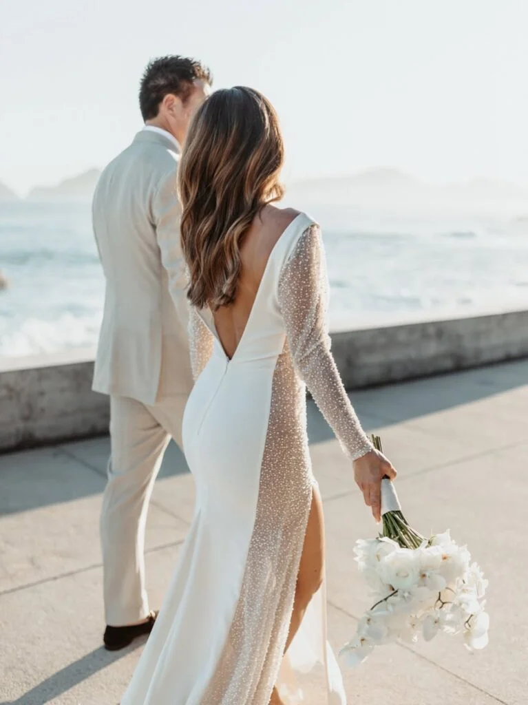 Minimal, modern, and quietly mesmerizing — this gown turns simplicity into art. The deep backline framed by pearl-sheer sleeves adds subtle glamour that feels right at home by the ocean.