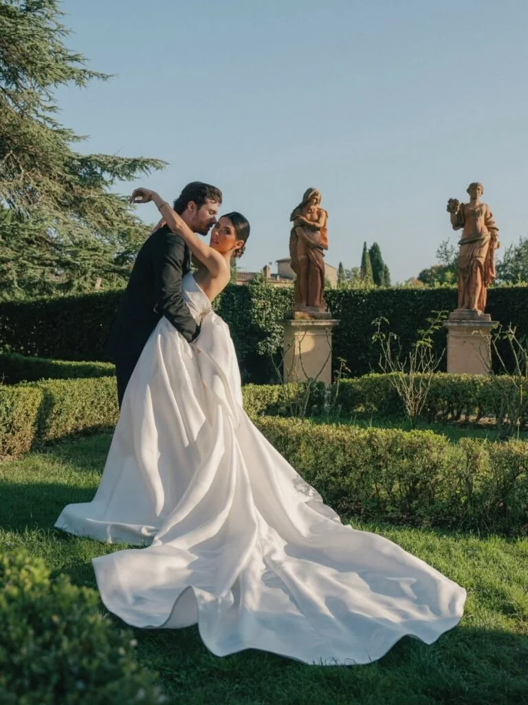 A ballroom-worthy gown with destination soul — this structured design with a sweeping train exudes modern royalty. The bride glows amid manicured gardens, her dress gleaming like sunlight on marble.