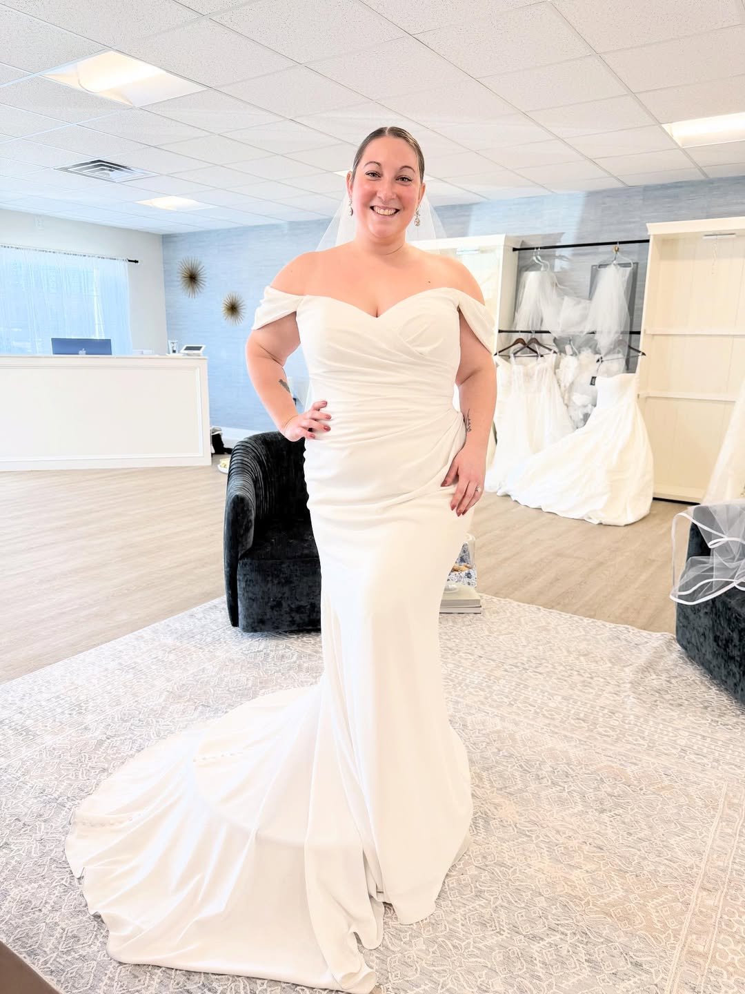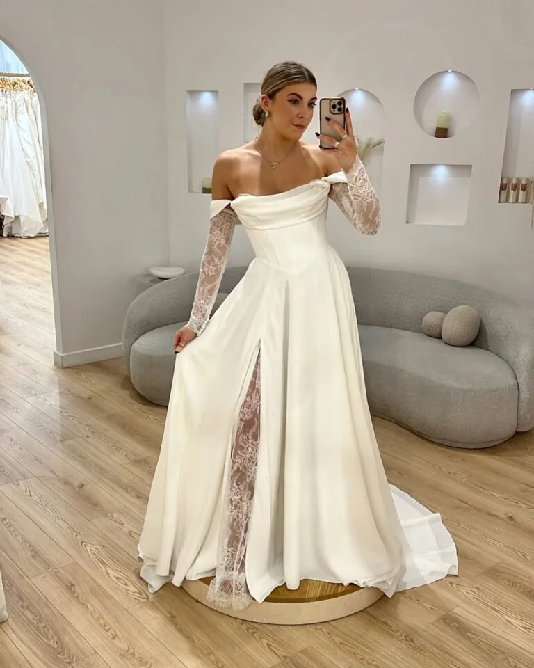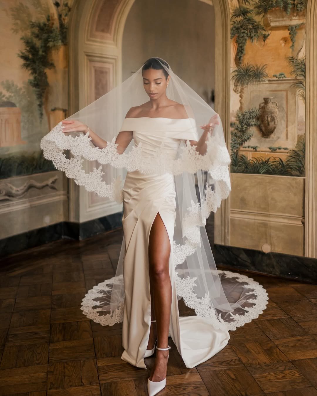 Soft satin, off-the-shoulder draping, and lace-edged veil — this look is pure high-fashion romance. The sculpted bodice hugs every curve while the long slit brings a sense of modern boldness that’s breathtakingly chic.