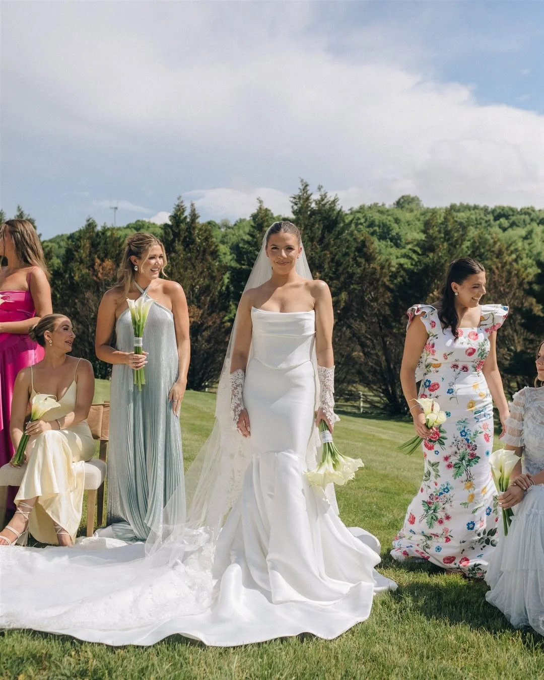 Set against lush greenery and joyful bridesmaids, this gown becomes part of a larger moment — one that feels alive with laughter, color, and light.
