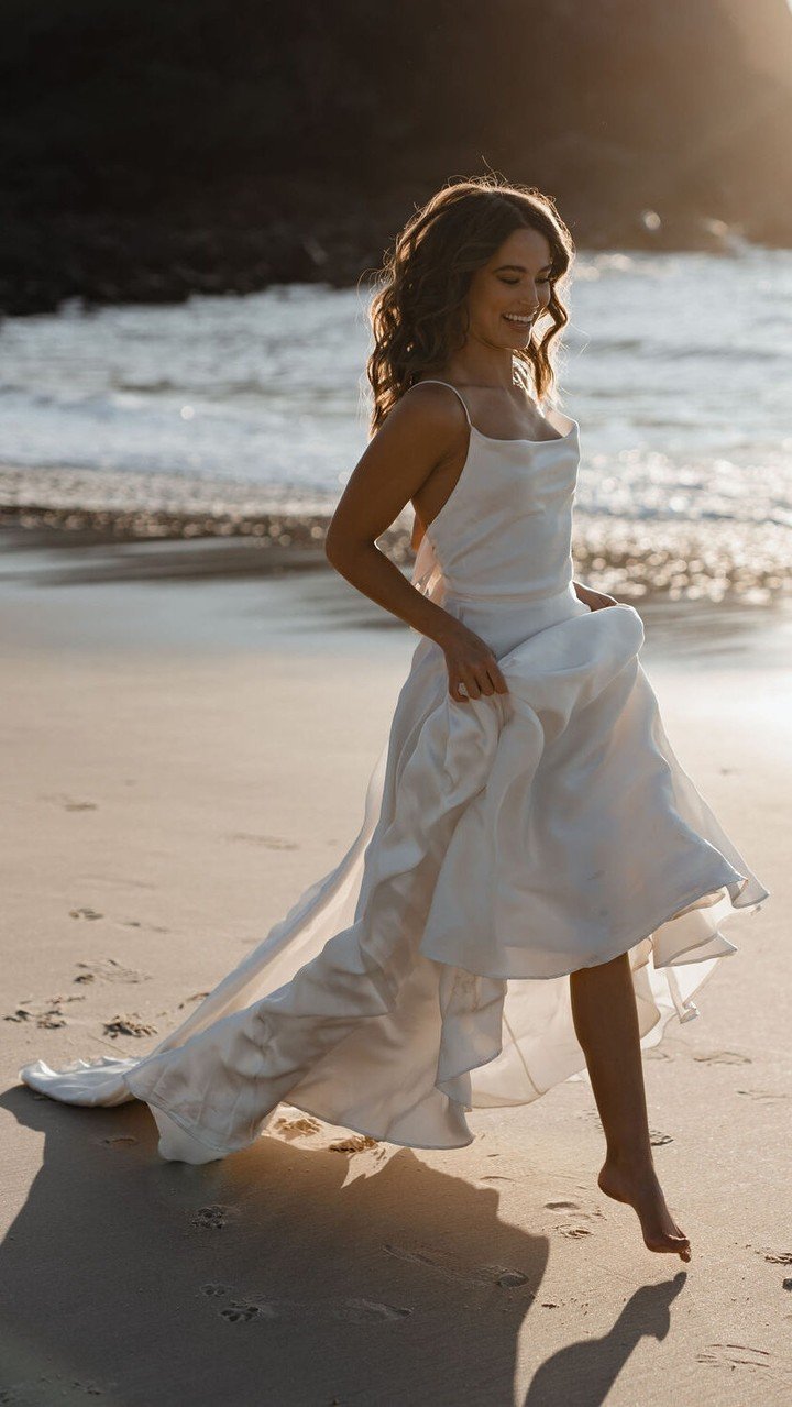 The creamy ivory hue pairs beautifully with the golden light of sunset, creating that cinematic glow brides dream of. It’s elegance in motion, captured right where sand meets sea.