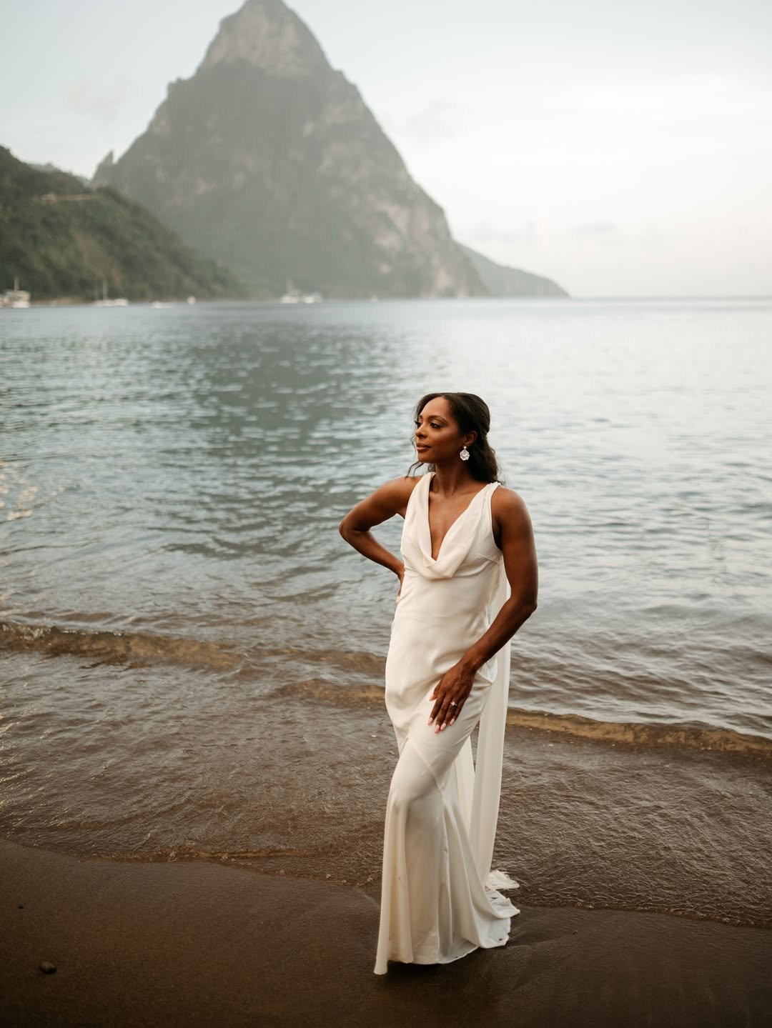 It’s simple but striking — the kind of gown that speaks through presence, not embellishment. Set against the mountain and ocean backdrop, it feels almost cinematic.