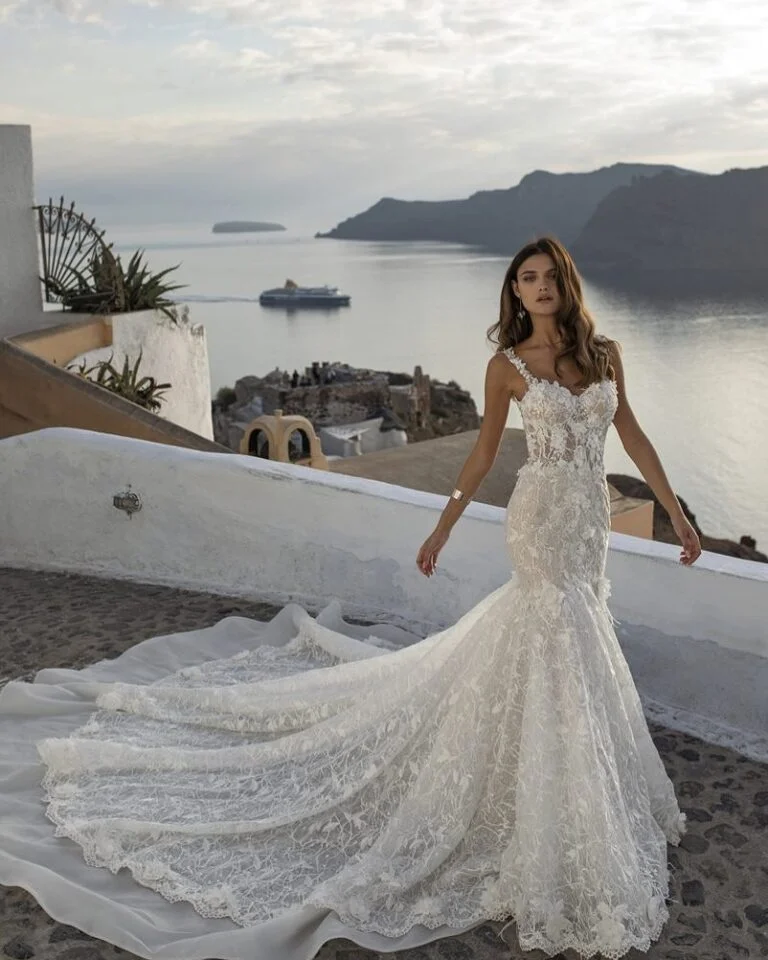 This lace mermaid gown could have walked straight out of a Santorini sunset. The intricate embroidery and sculpted silhouette feel rich and romantic, while the sweeping train adds drama without distraction.
