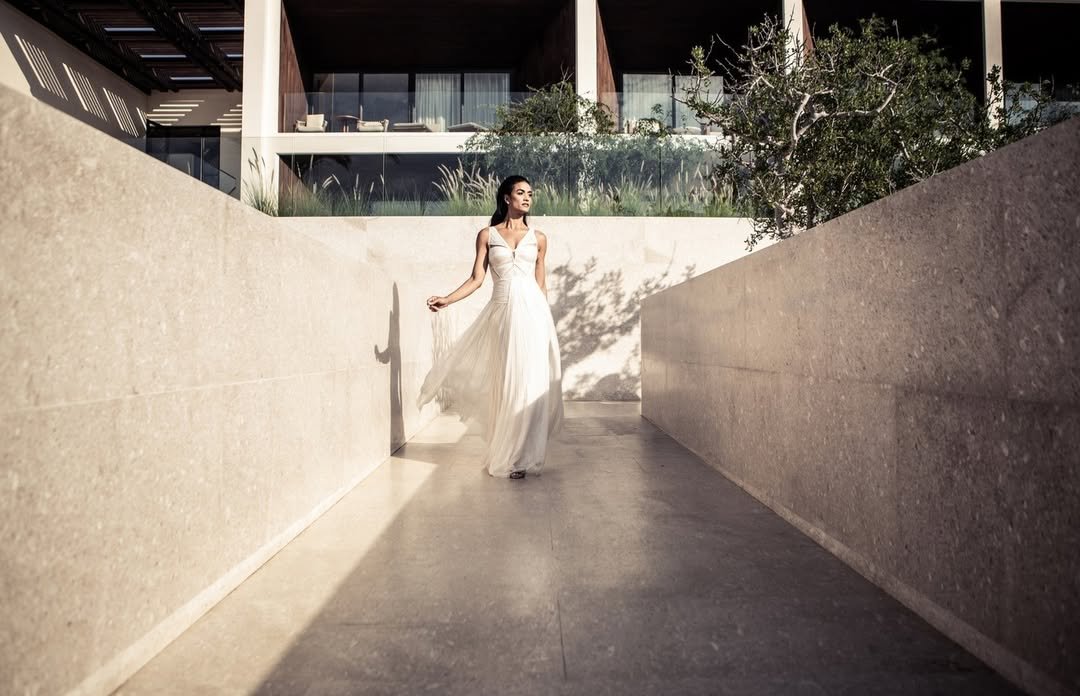It’s the kind of dress that shines in any setting — a mountaintop, a vineyard, or a private villa by the sea. The clean design keeps the focus on her smile, her joy, and the easy grace of the moment.