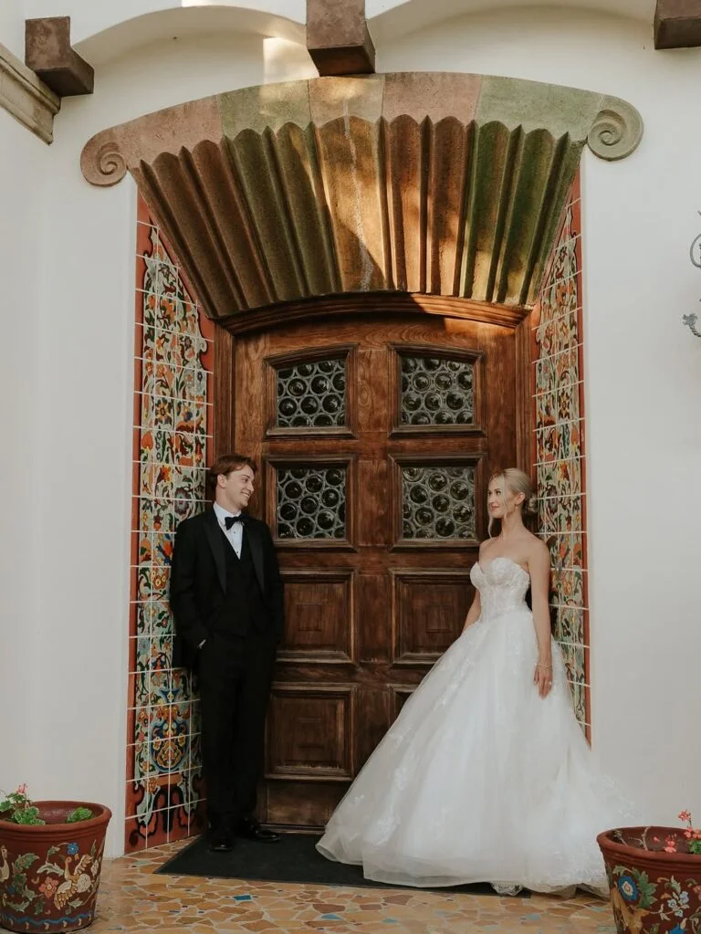 This photo feels like stepping into a classic European fairytale. The bride’s gown, with its voluminous skirt and structured bodice, radiates timeless charm. The intricate tilework and carved doorway create a cinematic frame that feels both regal and romantic.