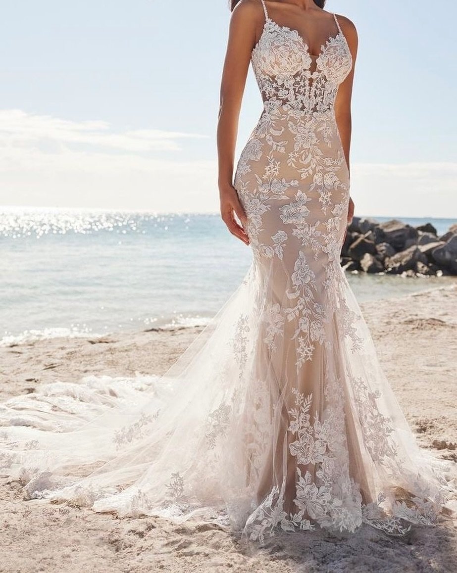 Intricate lace meets modern allure in this breathtaking mermaid silhouette. The semi-sheer bodice and floral embroidery shimmer under the sun, giving the gown an ethereal glow that perfectly complements the beach backdrop.