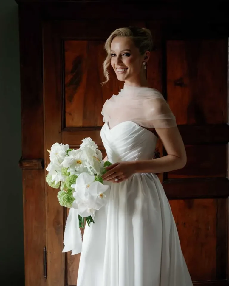 This gown is the embodiment of modern femininity. The sheer tulle wrap at the neckline softens the classic strapless shape, giving it a delicate, almost ethereal quality. It’s simple, but with just enough texture to make it unforgettable.