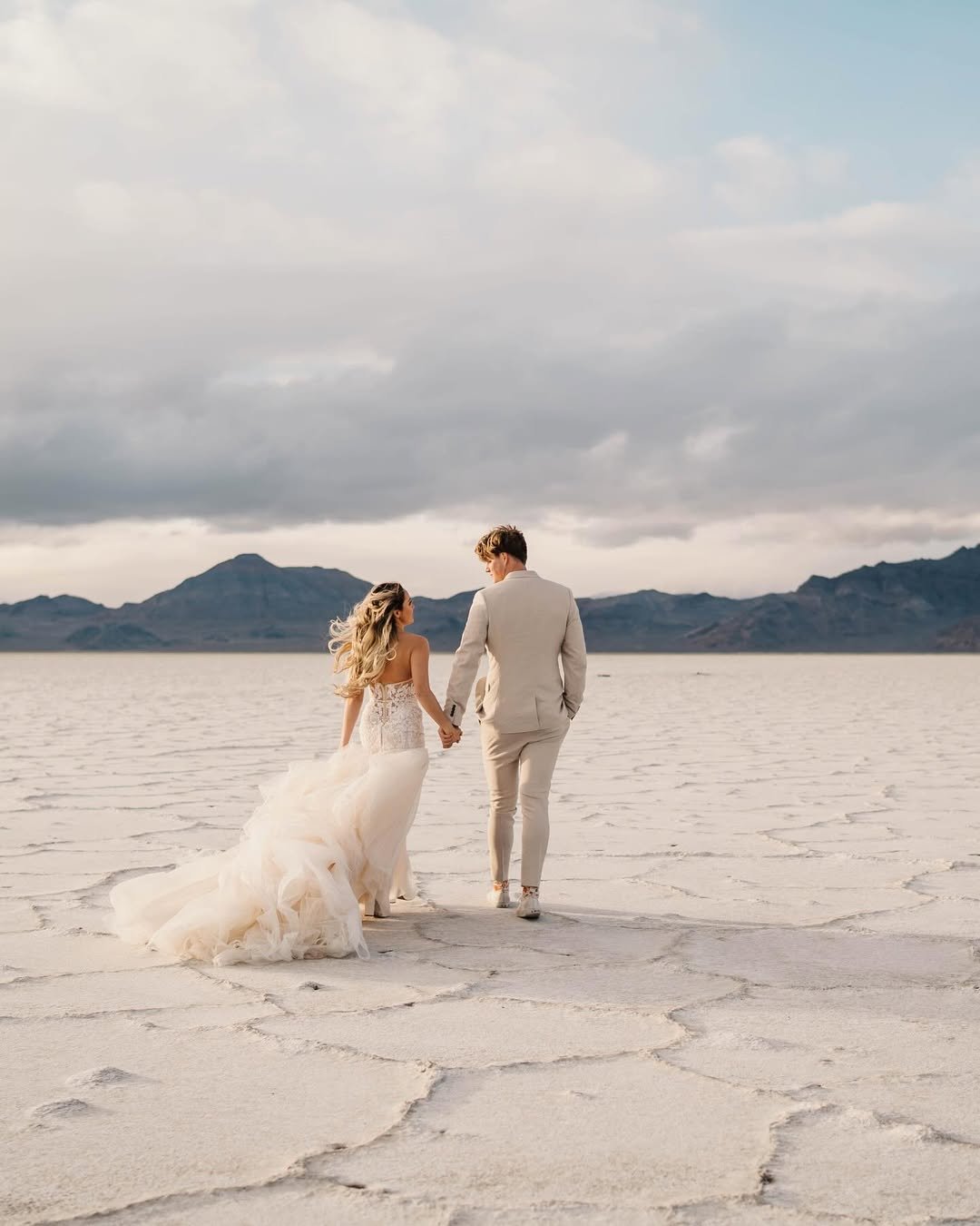 You can practically feel the crisp air of the salt flats in this photo — endless space, soft clouds, and two people who look like they’ve stepped out of a painting. The bride’s gown cascades in waves of blush-toned tulle, each layer moving like a whisper.