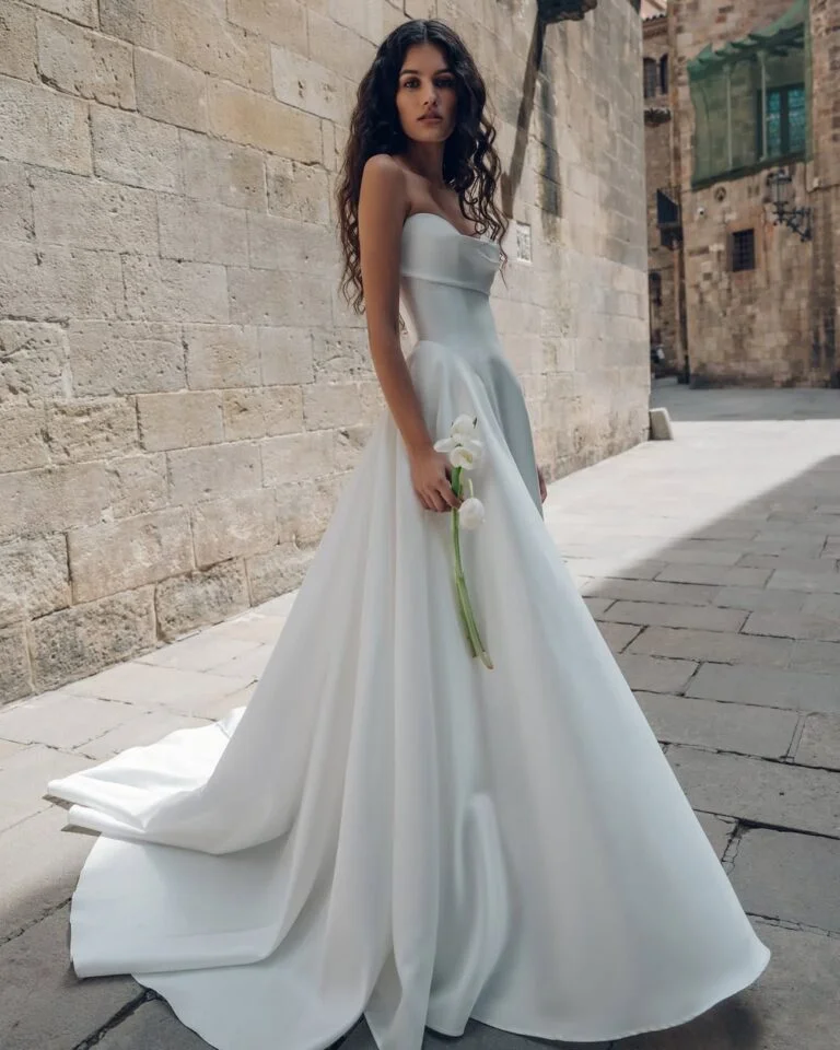 The train adds that subtle touch of grandeur without feeling heavy, ideal for intimate ceremonies in sunlit venues or quiet coastal resorts. There’s an ease to it — like a bride who knows she doesn’t need sparkle to shine.