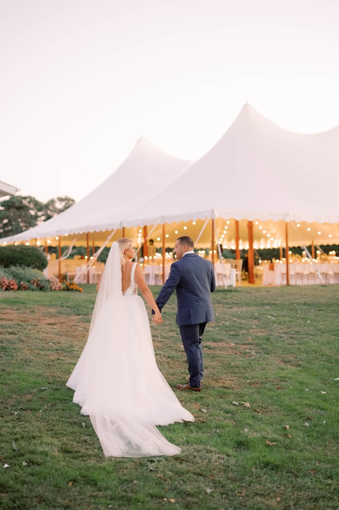 Classic, dreamy, and filled with golden-hour glow — this image is the essence of destination wedding romance. The full tulle gown trails behind her as the lights from the tent flicker to life, creating the perfect evening backdrop.