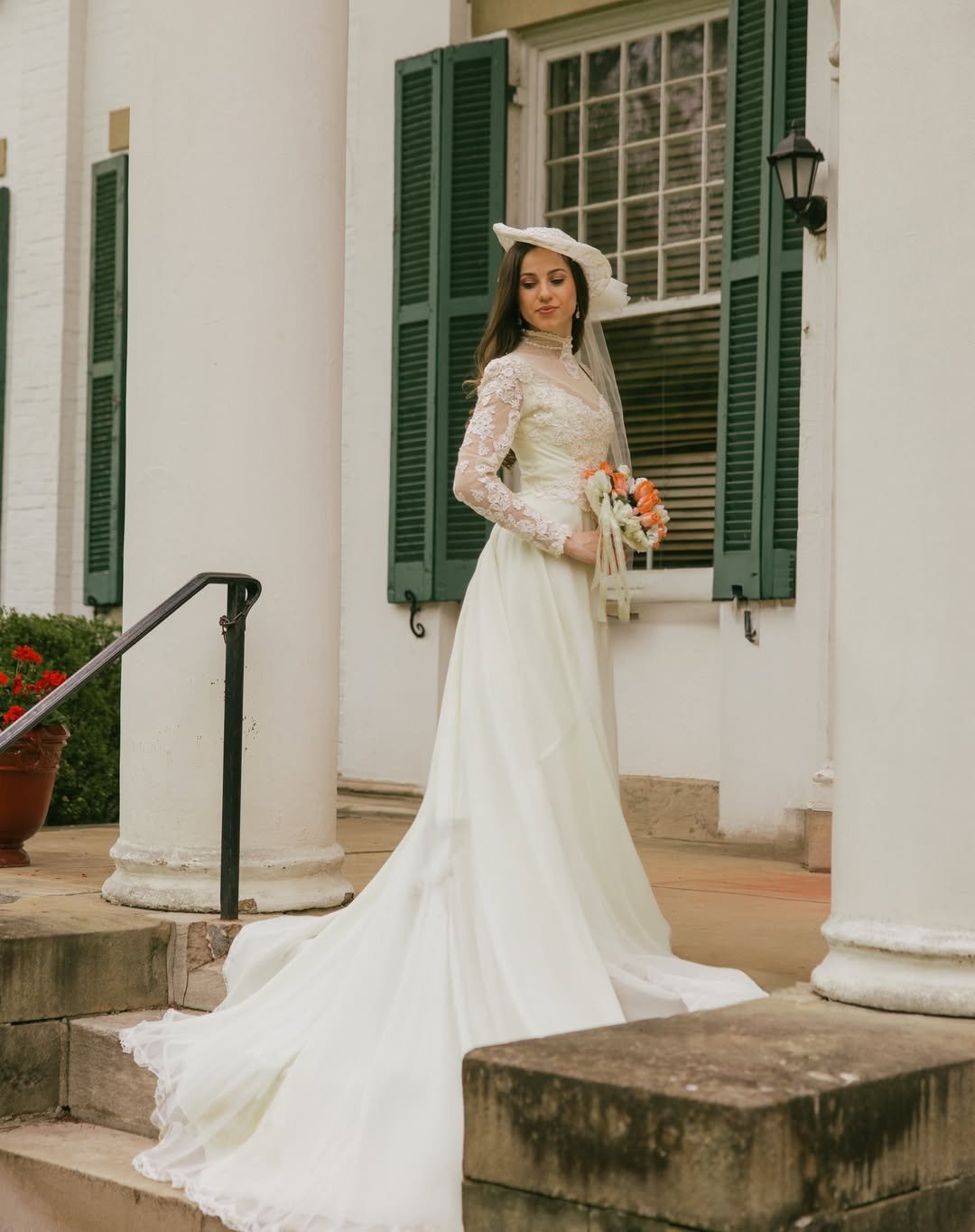 It’s the kind of gown that fits perfectly with historic estates and ivy-covered walls — where time slows down and details matter. The soft hat and bouquet add to the charm, transforming her into a living painting.