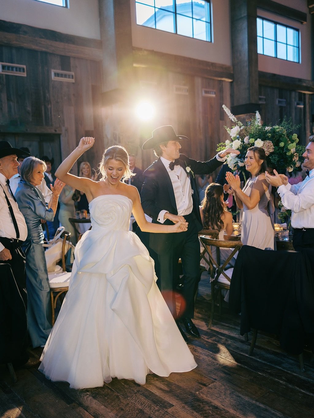 Who says destination weddings can’t have a touch of country glam? This bride brings the energy — a voluminous gown blooming like a rose and a partner in a classic tux and cowboy hat, dancing through cheers and laughter.