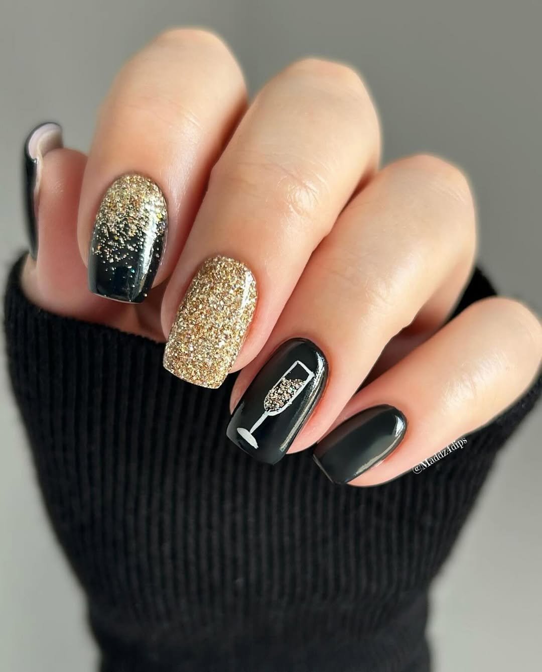 This one is sleek, bold, and unapologetically glam. The deep black base with gold dip powder accents feels very “champagne at midnight” in the best way. It’s dramatic, but still polished.