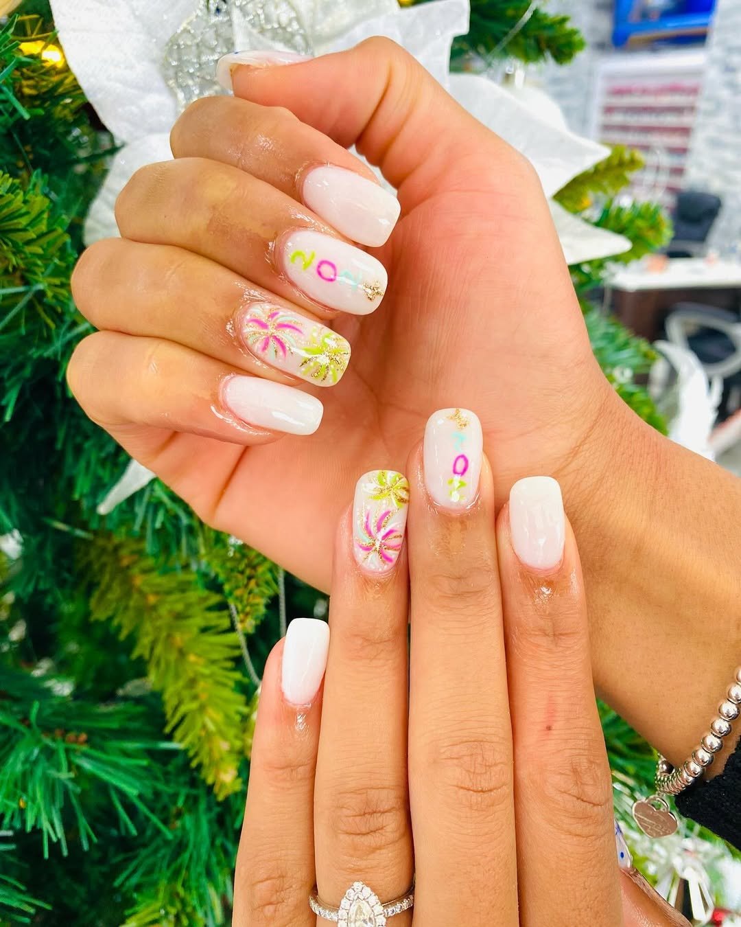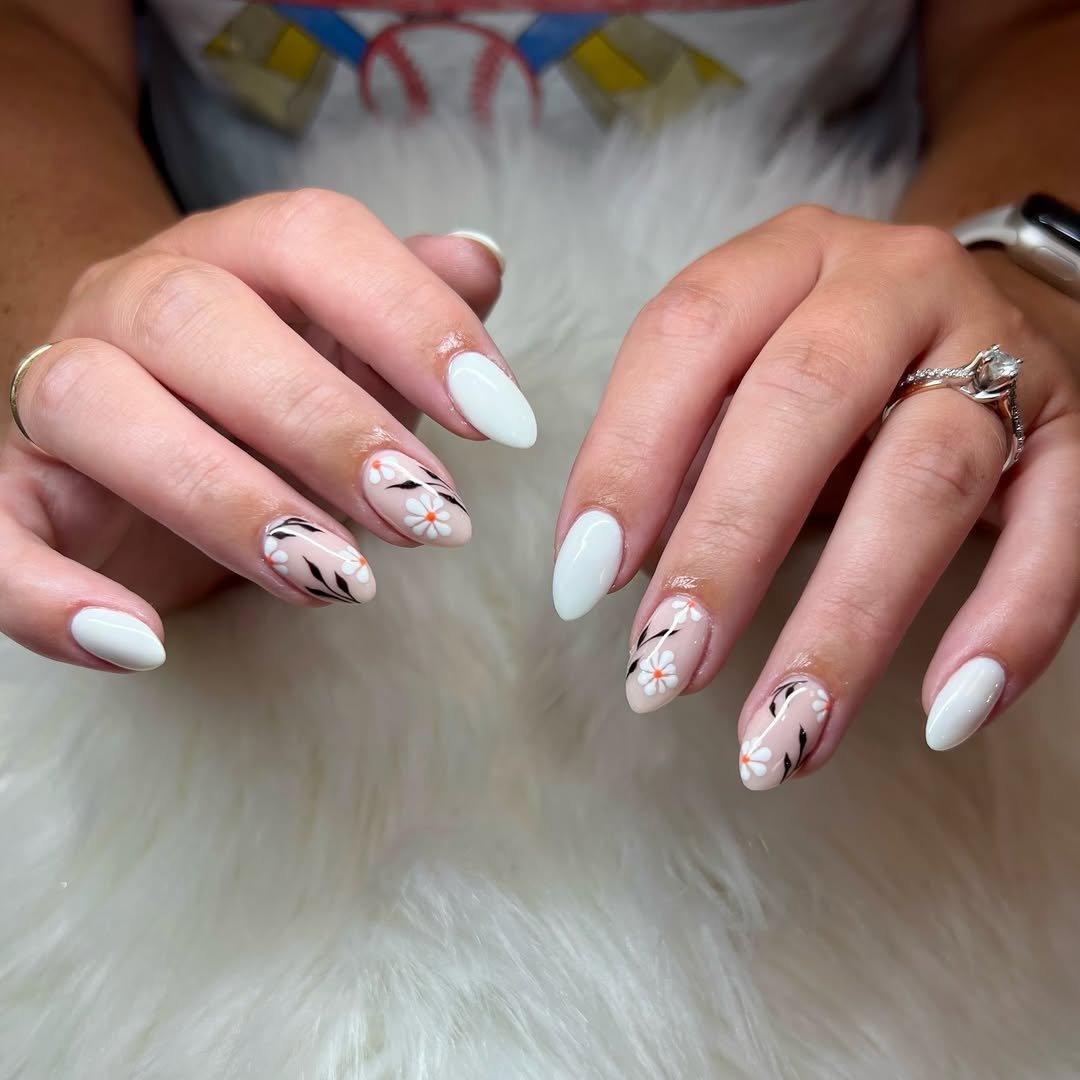 This is minimal done right. Milky white nails paired with delicate floral linework feel airy, light, and incredibly polished.