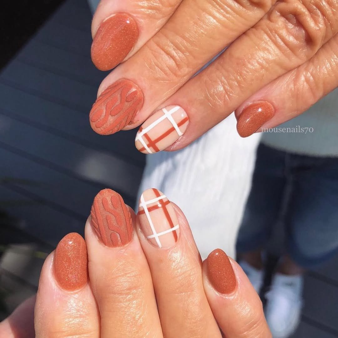 This set feels like peak fall comfort. Warm cinnamon tones mixed with soft neutrals and that subtle plaid moment give major “favorite sweater, but make it nails” energy. It’s detailed without being loud, which is honestly harder to pull off than it looks.