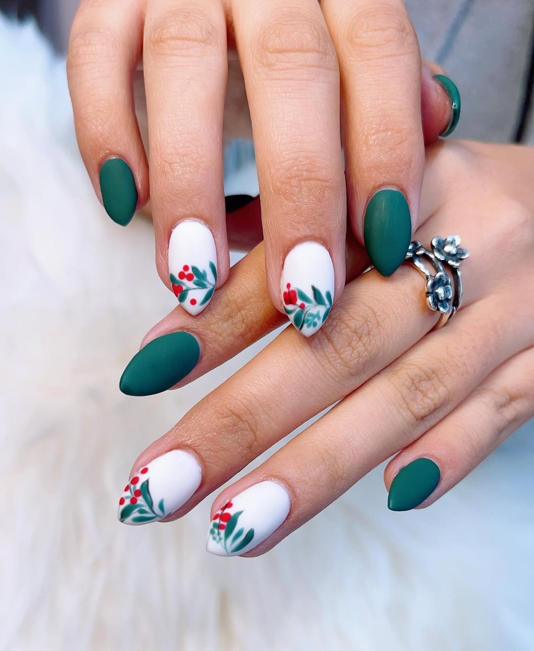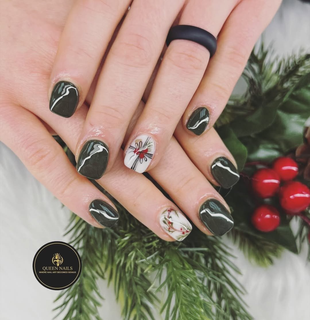 Deep forest green with crisp white accents is such a power combo. It instantly reads wintery without screaming holiday, and that single detailed nail adds just enough drama to keep things interesting.