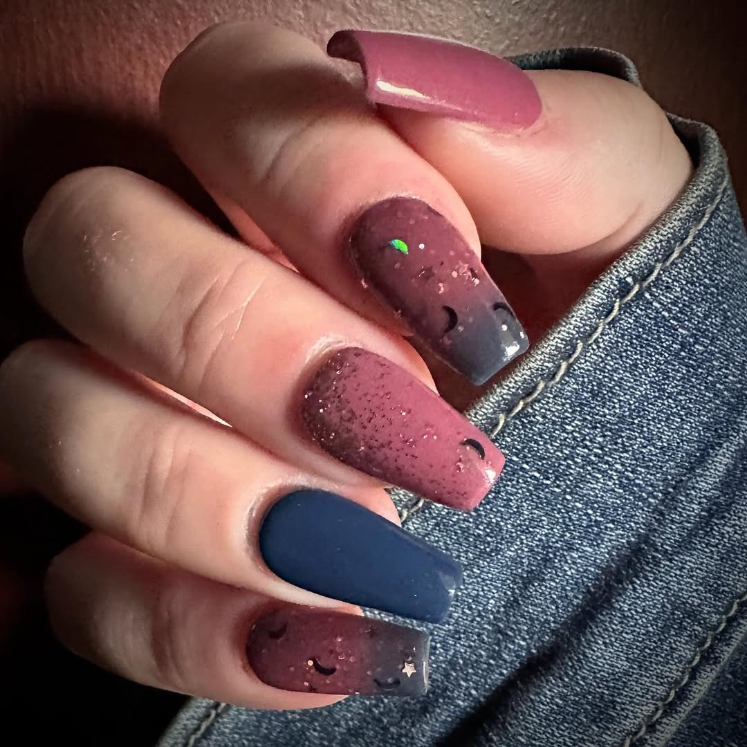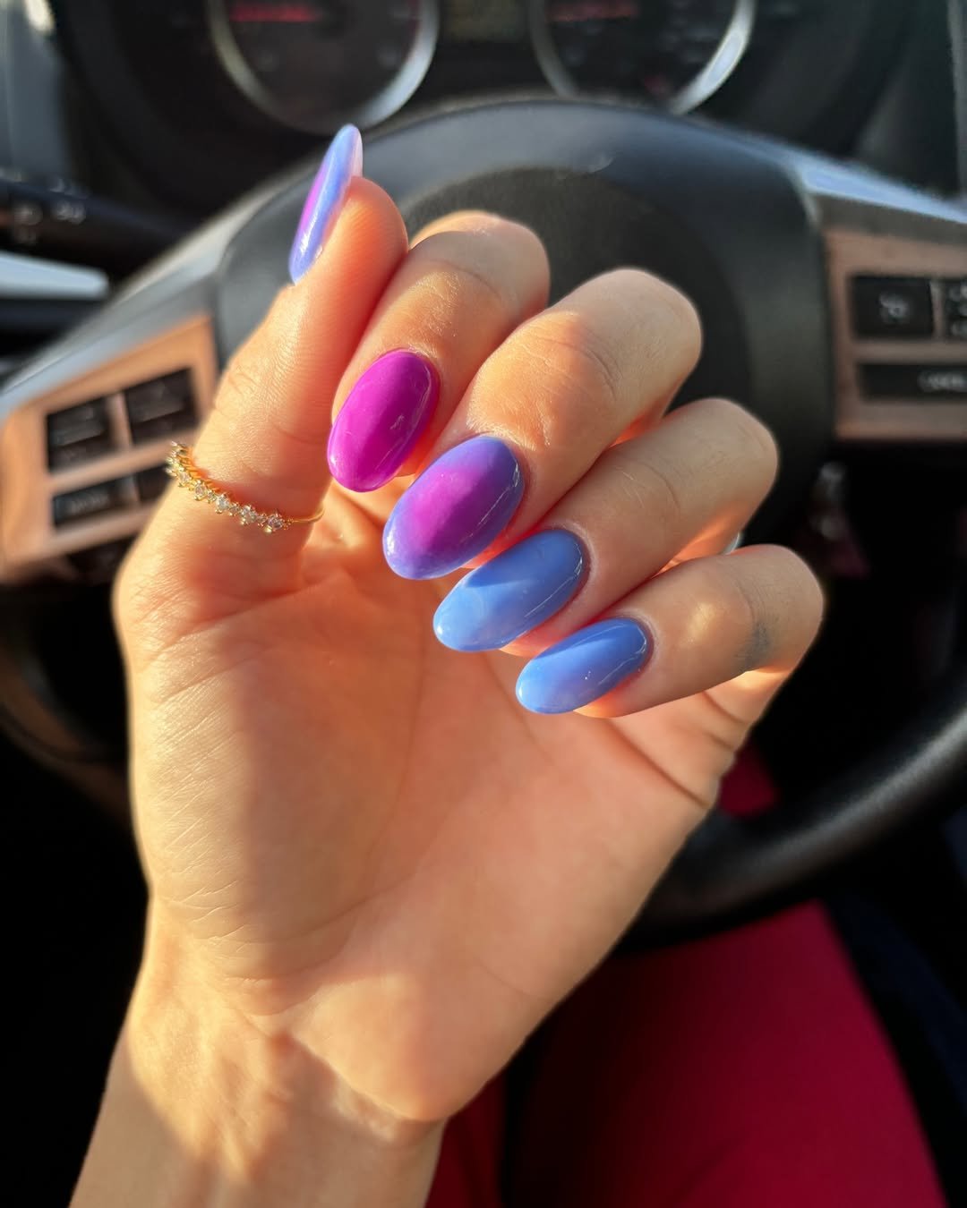 This set feels like golden hour through a windshield. The blend from soft lavender into sky blue has that smooth, melt-into-each-other finish that dip powder does so well. It’s glossy, clean, and quietly mesmerizing.
