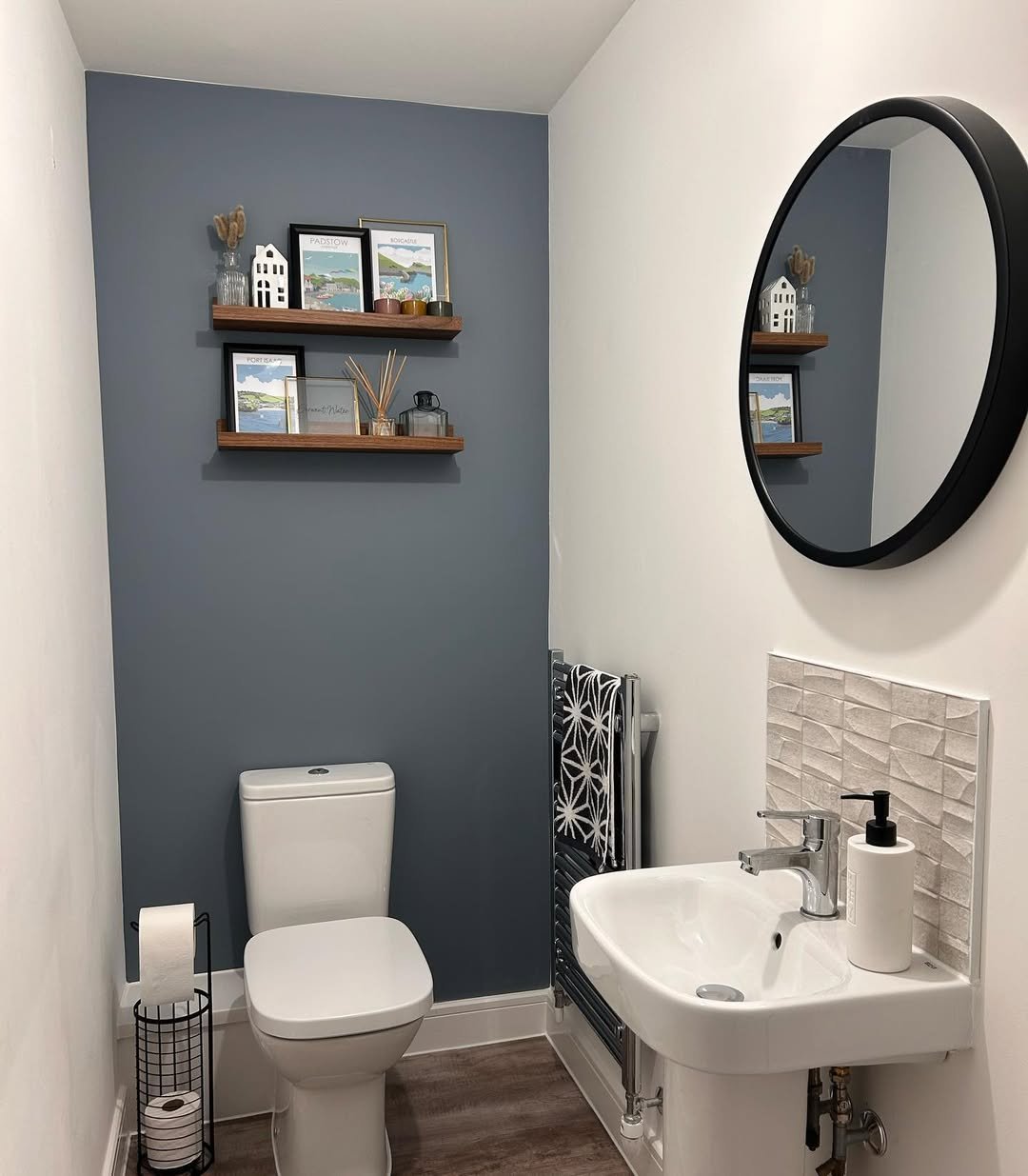 The shelves aren’t just decorative—they add depth and make the space feel more lived-in, like someone actually enjoys being in here (rare for a downstairs loo, honestly).