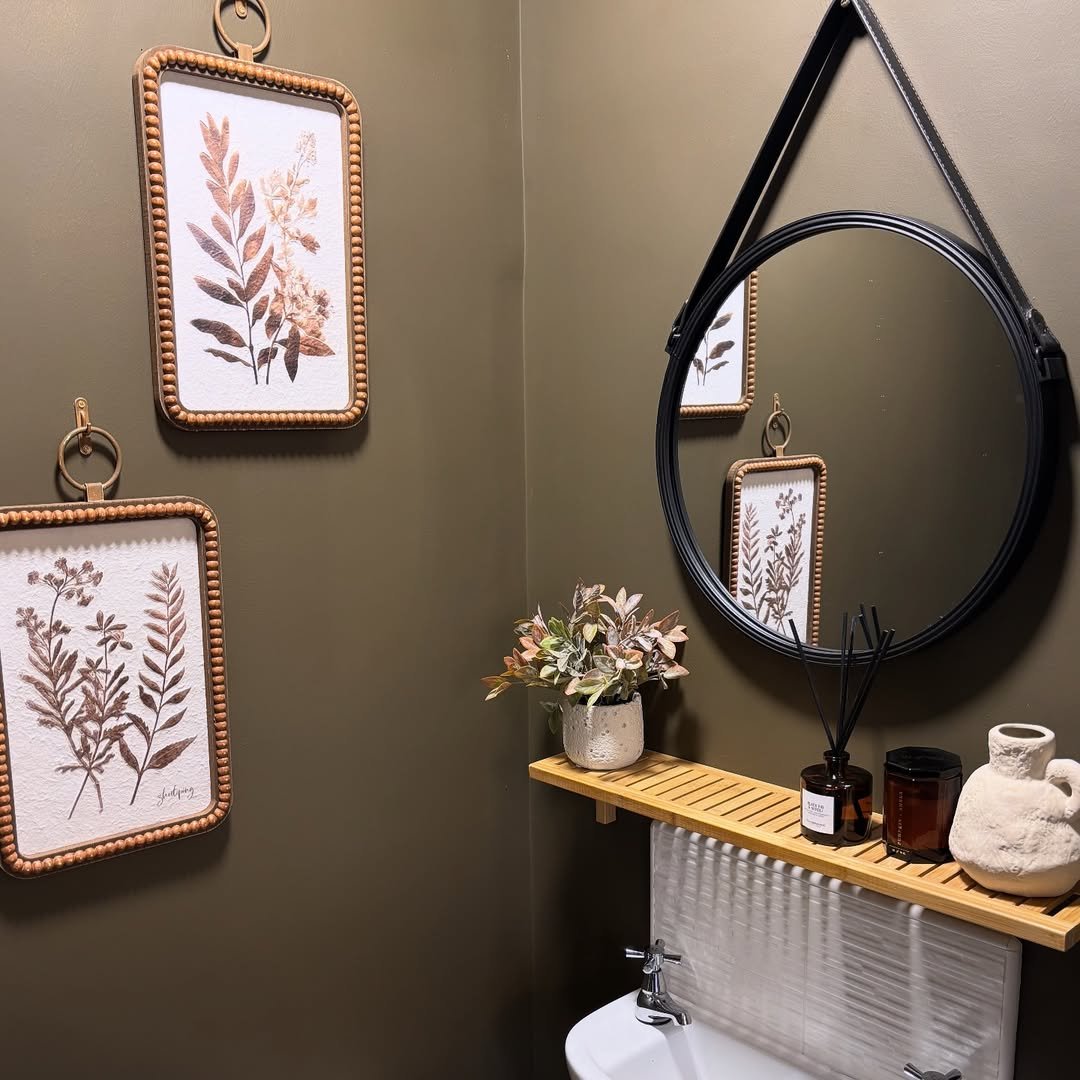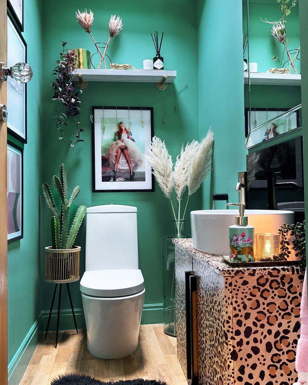This little nook is doing a lot—and somehow it all works. The rich green walls, that leopard-print vanity, and the shelf styling with pampas, plants, and a touch of gold… it’s giving personality in the best way.