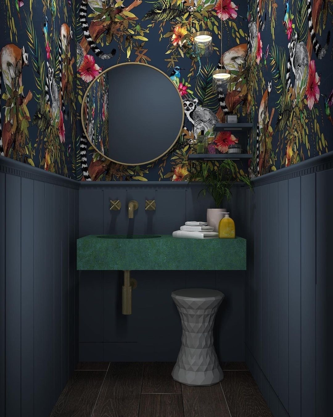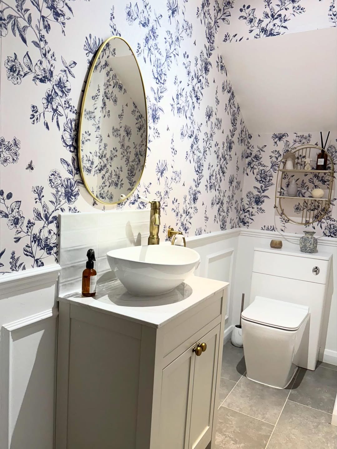 Now this one leans a bit bolder—but in a very refined way. That blue-and-white wallpaper brings in personality, while the traditional vanity and brass fixtures keep it grounded.