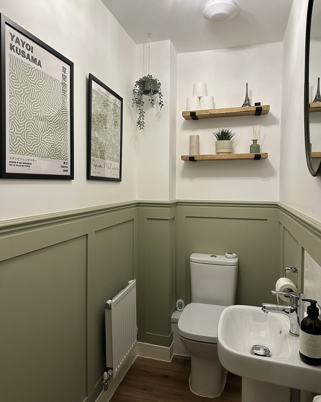 There’s something about this muted green paneling that instantly calms the space. Paired with those framed prints, it leans slightly artsy without losing that cozy home feel.