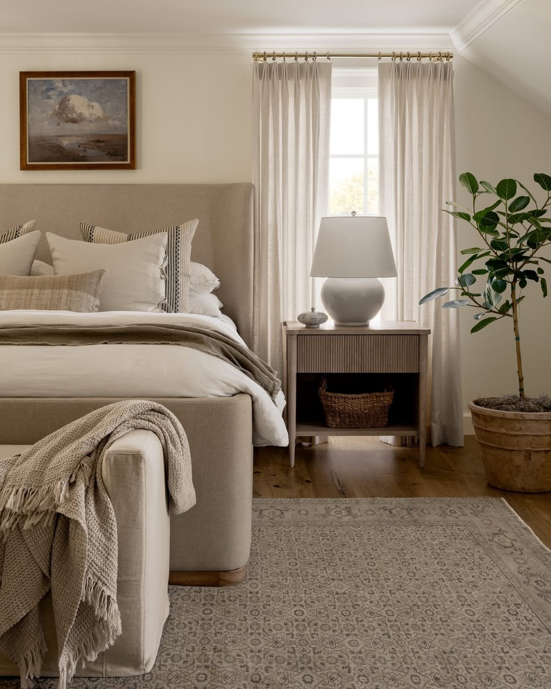 This space feels like a perfectly curated collection of calm. Soft neutrals stack effortlessly, from the upholstered bed to the woven rug and that inviting bench at the foot. The palette stays close to cream, taupe, and warm wood, creating a sense of quiet continuity.