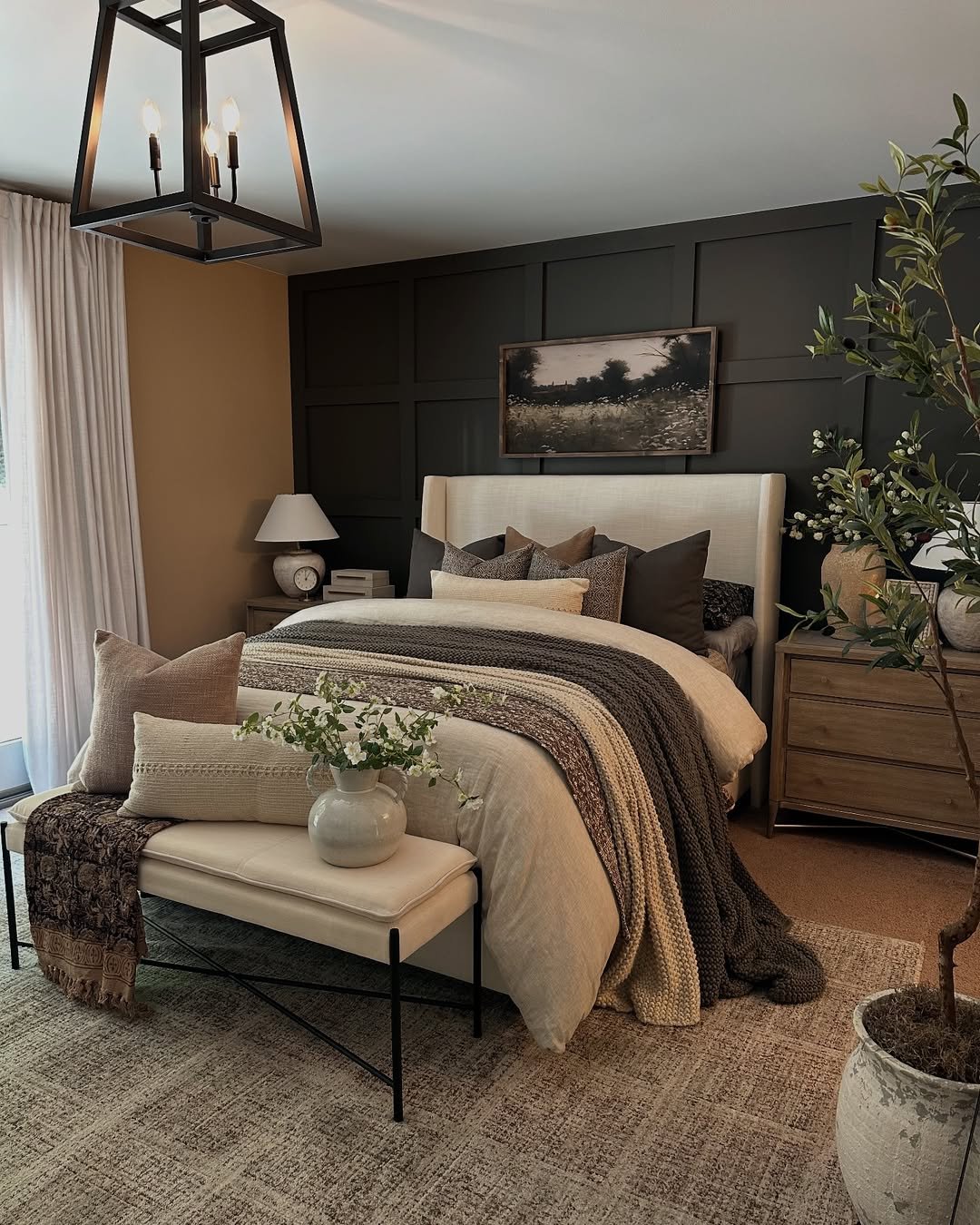 There’s a richness here that feels instantly grounding. A deep paneled wall sets the tone, balanced by creamy bedding and layered knit throws that soften the look. The mix of dark and light creates a contrast that feels cozy rather than dramatic.