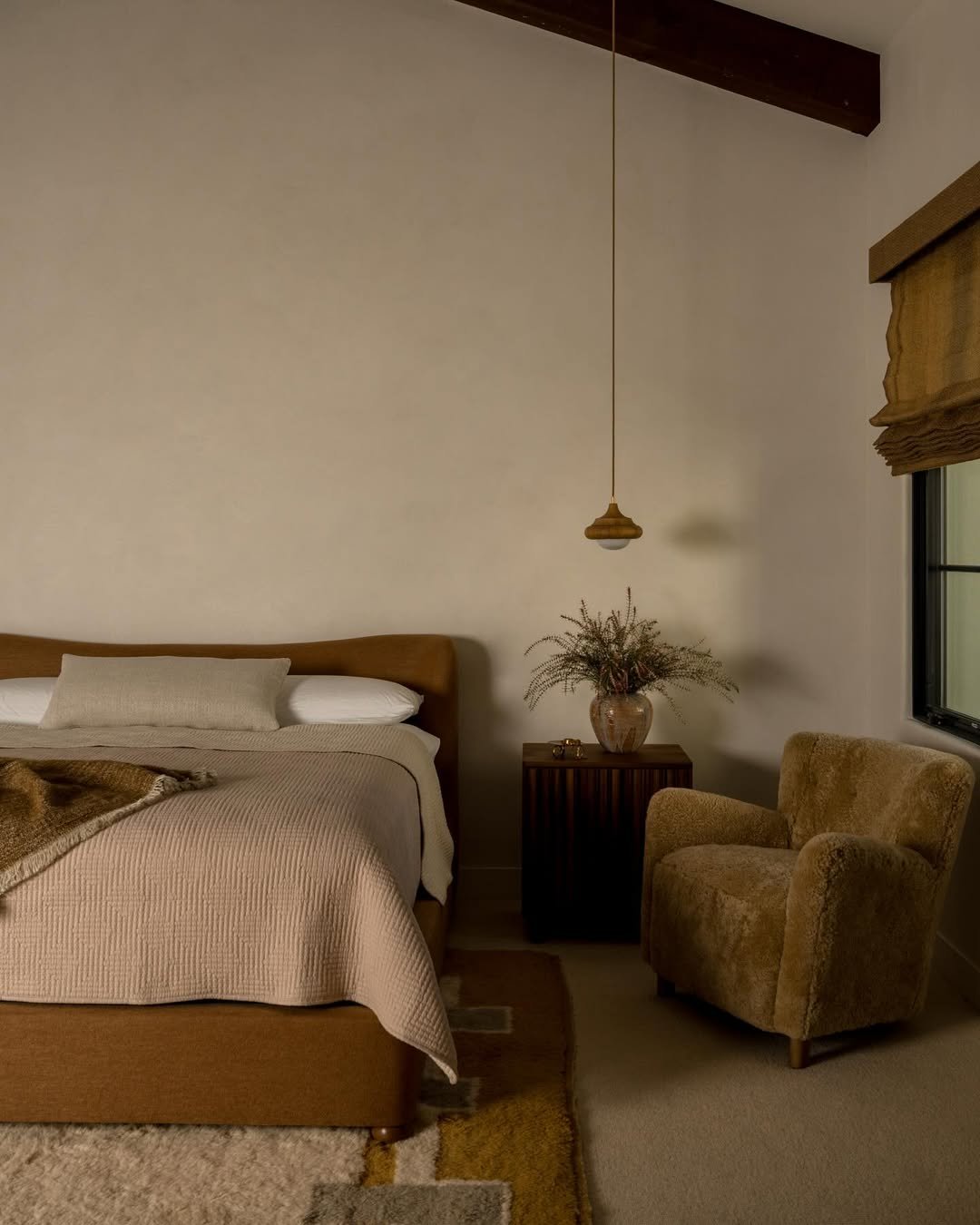 What makes it work is the balance of emptiness and detail. A plush chair, a quiet arrangement on the side table, it all feels edited but never bare. It’s the kind of space that invites slow mornings and early nights without asking for attention.