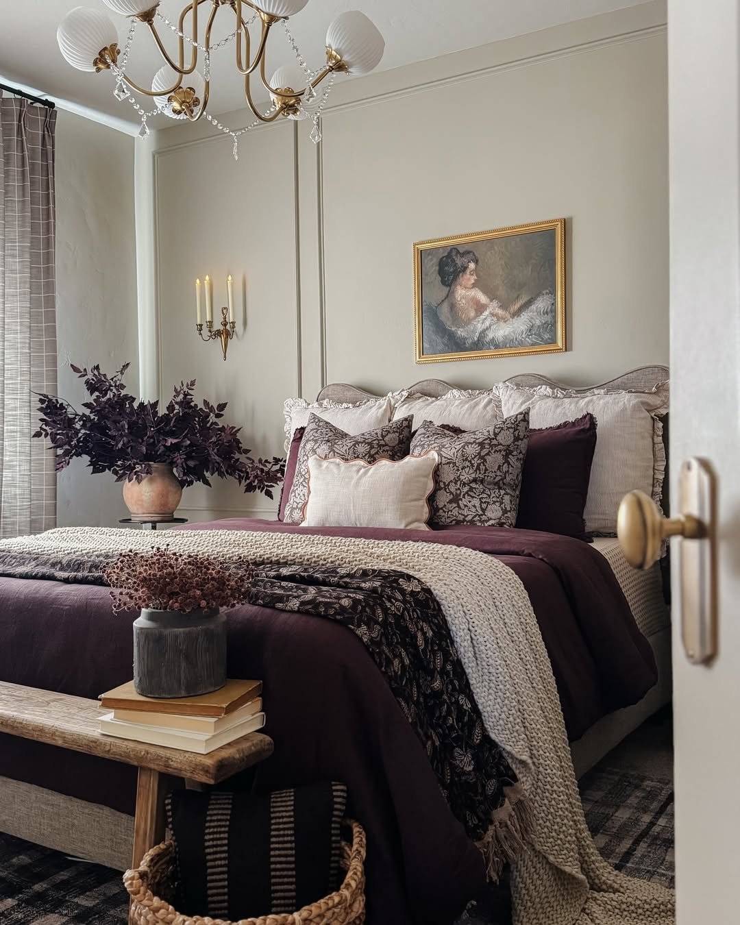 And then there’s the lighting. Wall sconces, candles, and that soft overhead glow build a mood that feels intimate without being heavy. It’s the kind of bedroom that feels best at dusk, when everything slows down just a little.