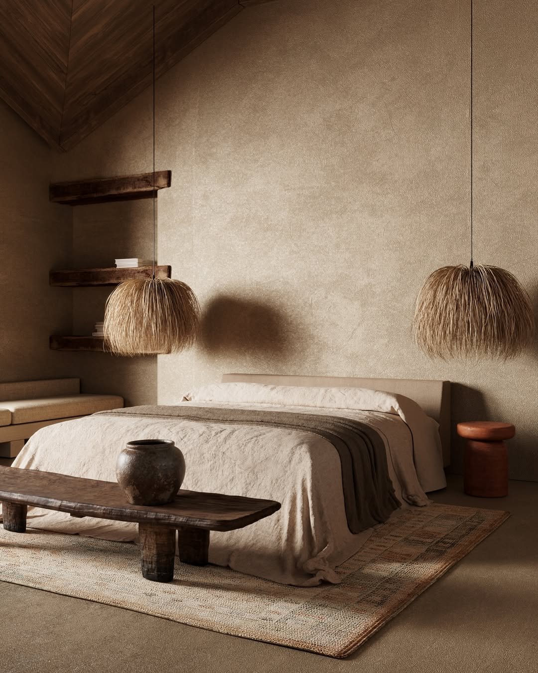 This room feels like stepping into stillness. Raw wood, soft linen, and textured walls create a palette that leans entirely into nature. The low bed and minimal styling keep the focus on material and light.