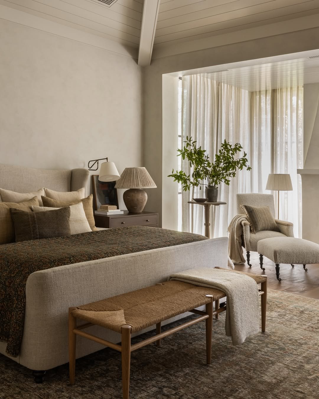 There’s something about this space that feels like a quiet exhale. Creamy upholstery, washed linen bedding, and that woven bench at the foot of the bed create a palette that leans into softness without losing structure. The muted browns and oat tones melt into each other, while sheer curtains filter light like a warm afternoon glow.