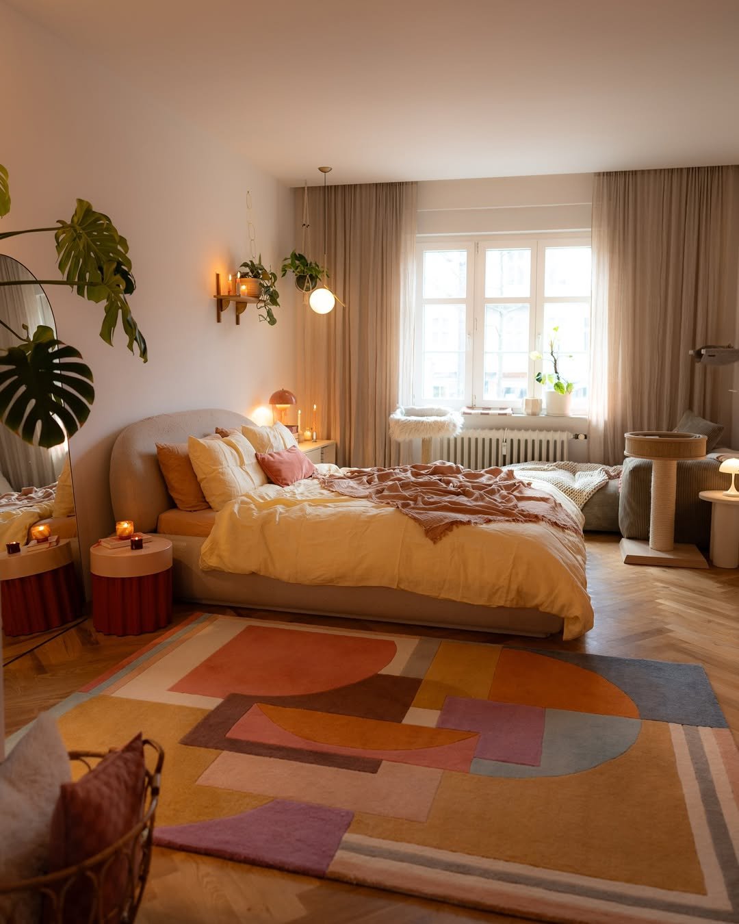 It’s less about perfect styling and more about feeling. Plants, soft throws, and ambient light bring life into the room. This is the kind of bedroom that invites you to slow down without even trying.