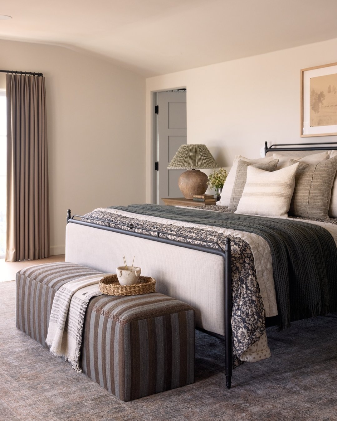 This bedroom feels polished in the most relaxed way. A structured bed frame, tailored bedding, and that striped ottoman at the foot create a look that’s clean but never sterile. The palette leans into taupe, cream, and charcoal, giving it depth without heaviness.