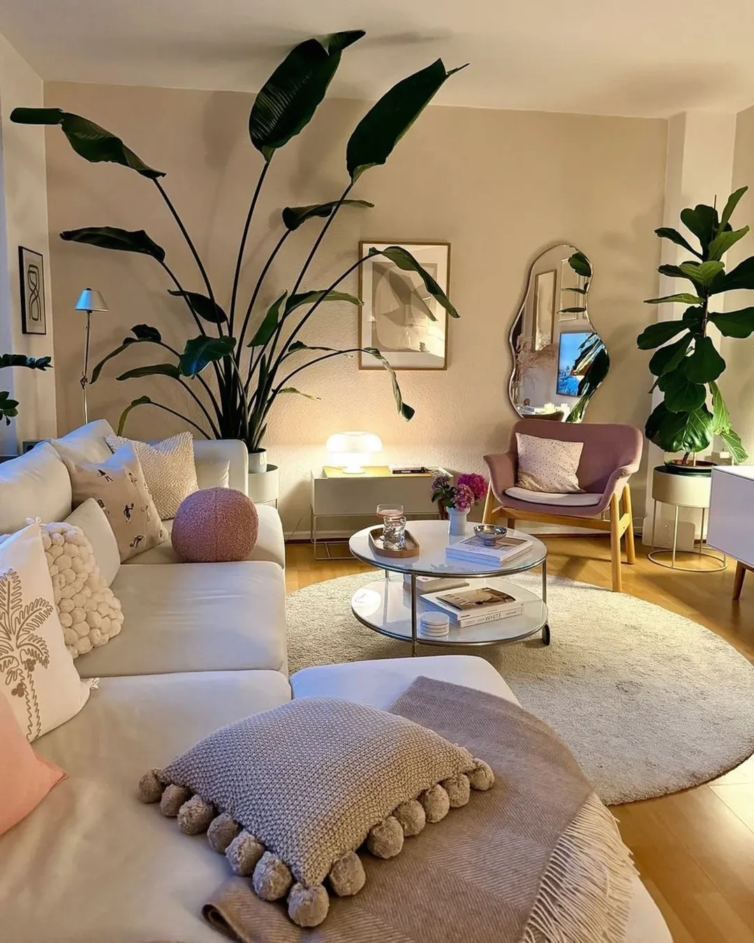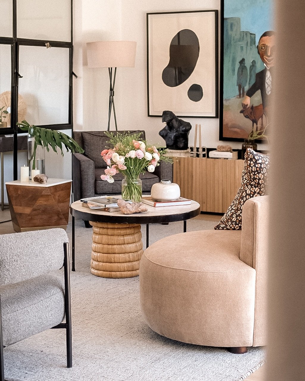 Curved furniture and sculptural details give this room a quiet sophistication. Soft neutrals dominate, creating a layered look that feels elegant without being too polished. Every piece feels like it belongs exactly where it is.