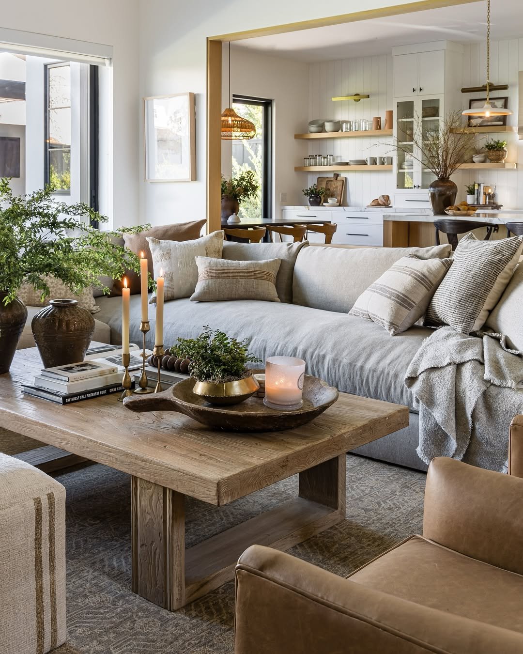 Light pours into this space in the most effortless way, wrapping around that caramel-toned sofa and soft woven textures. The greenery adds a fresh contrast, while the terracotta floor anchors everything with warmth and depth. It feels like a lived-in story, not just a styled moment.