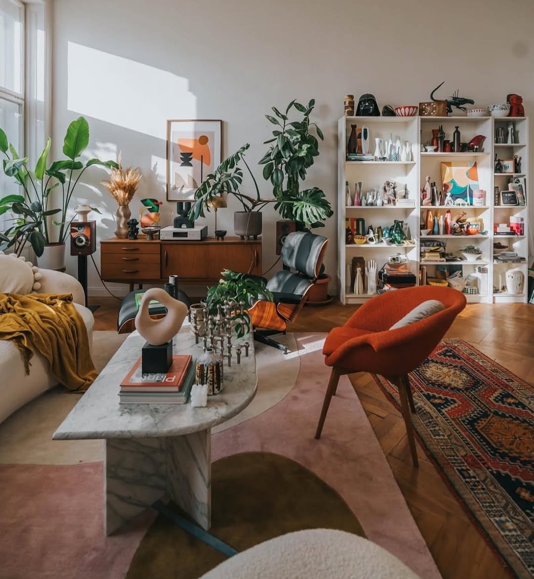 This space feels collected and full of personality. Earthy tones mix with bold accents, creating a layered look that feels both artistic and grounded. Every corner has something to discover.