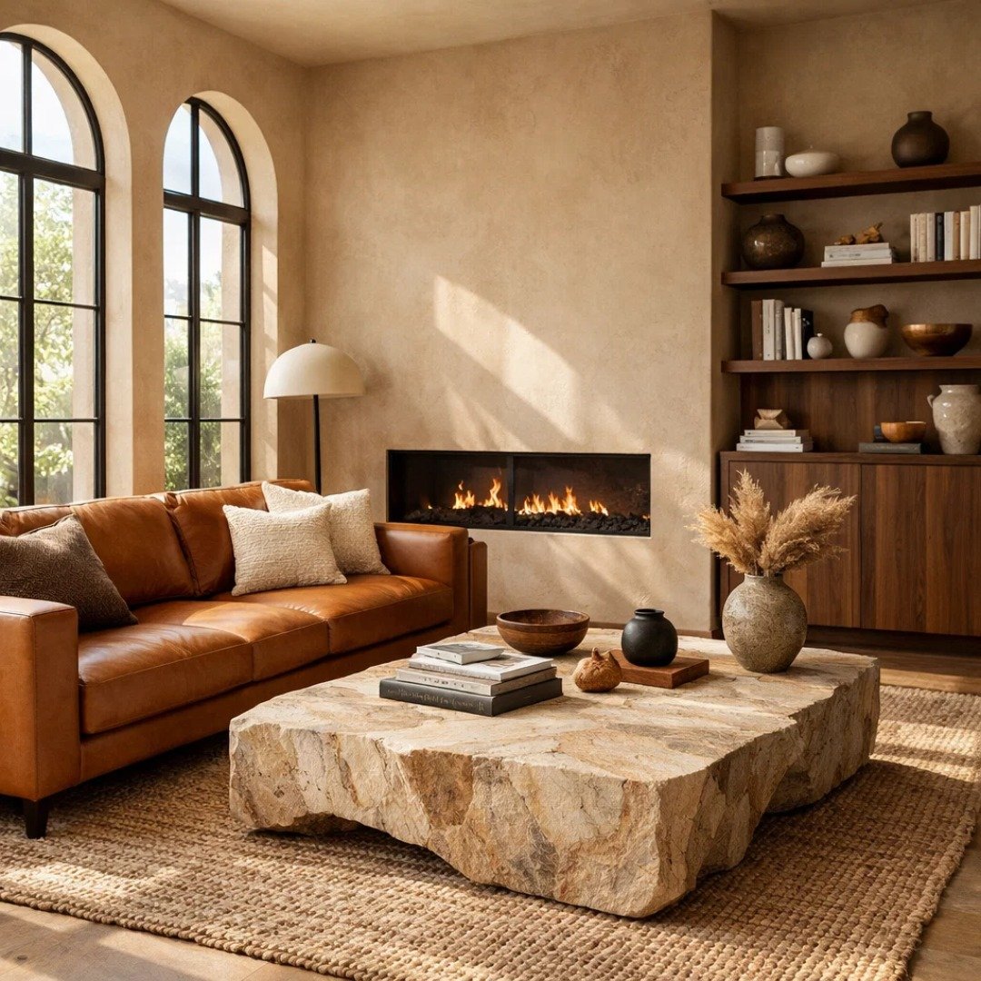 This room feels like a deep exhale. Soft sandstone walls, warm leather seating, and that chunky stone coffee table come together in a way that feels both grounded and quietly luxurious. Sunlight spills through those arched windows, adding just enough glow to make everything feel alive.