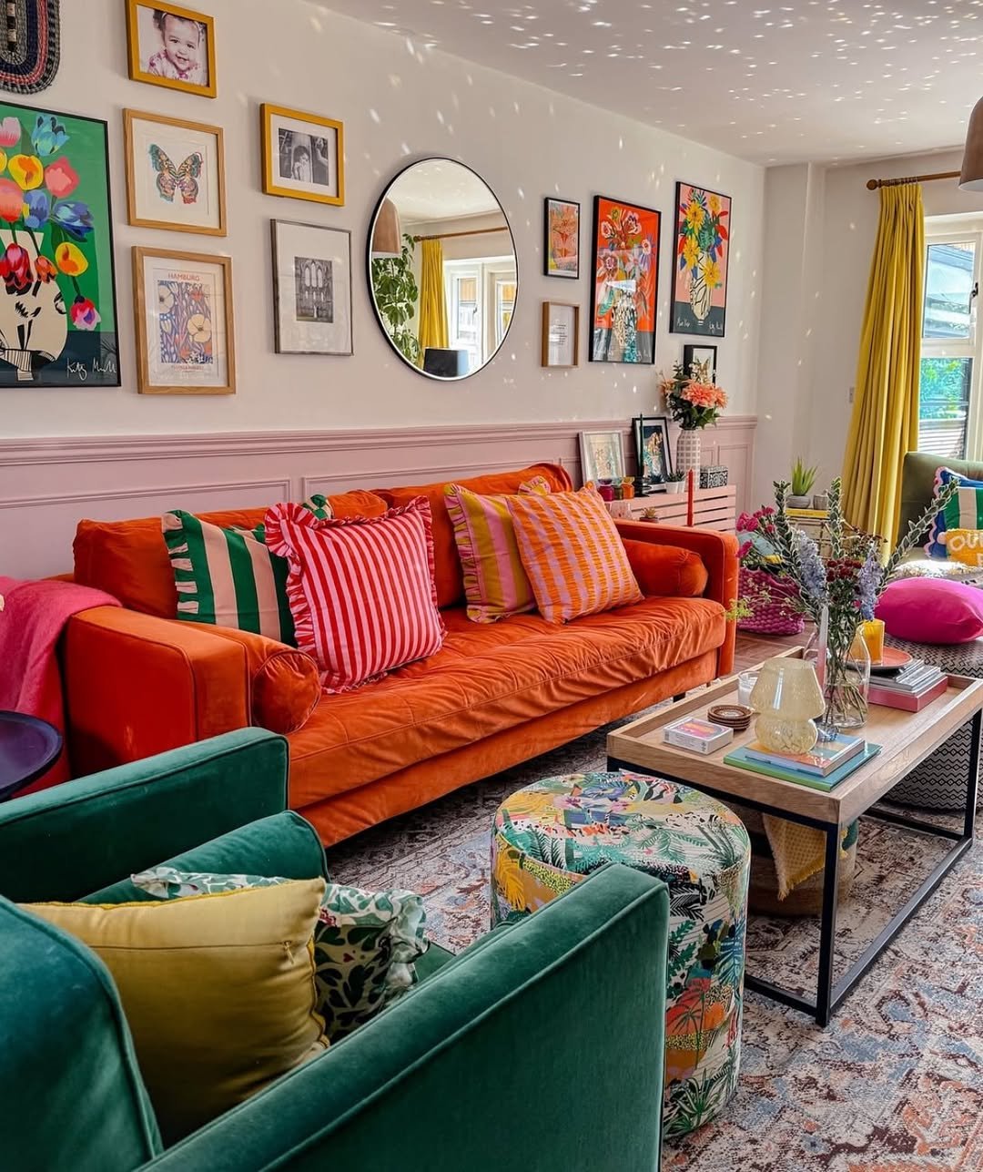 There’s a softness to this space that feels instantly welcoming. The muted blush sofa paired with ochre and rust cushions creates a warm, layered palette that feels both grounded and a little playful. Patterns weave through the room in a subtle way, from the rug to the accent chairs, giving it that collected, lived-in charm.