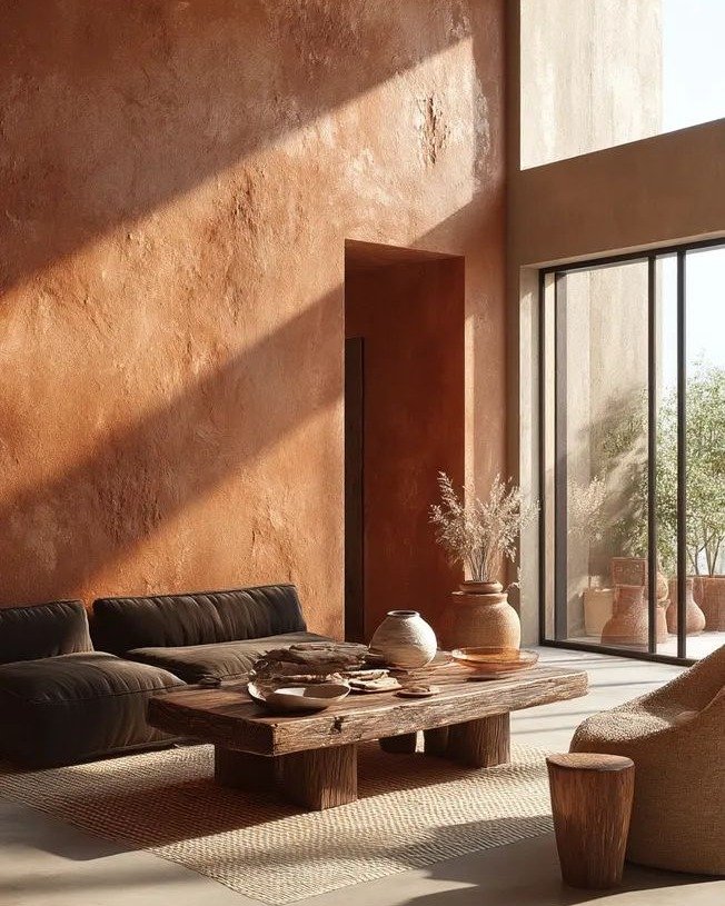 This space feels almost sculptural in its simplicity. Warm clay-toned walls, low wooden furniture, and soft natural light create a composition that feels grounded and intentional. Every element feels carefully placed, yet never forced.