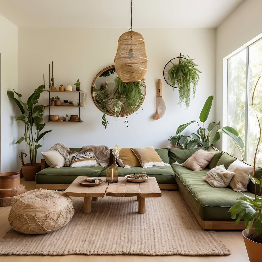 Muted green seating brings a calm, grounded energy into this space, softened further by natural wood and layered textiles. Hanging plants and woven elements create a sense of quiet movement, almost like the room is gently breathing with you.