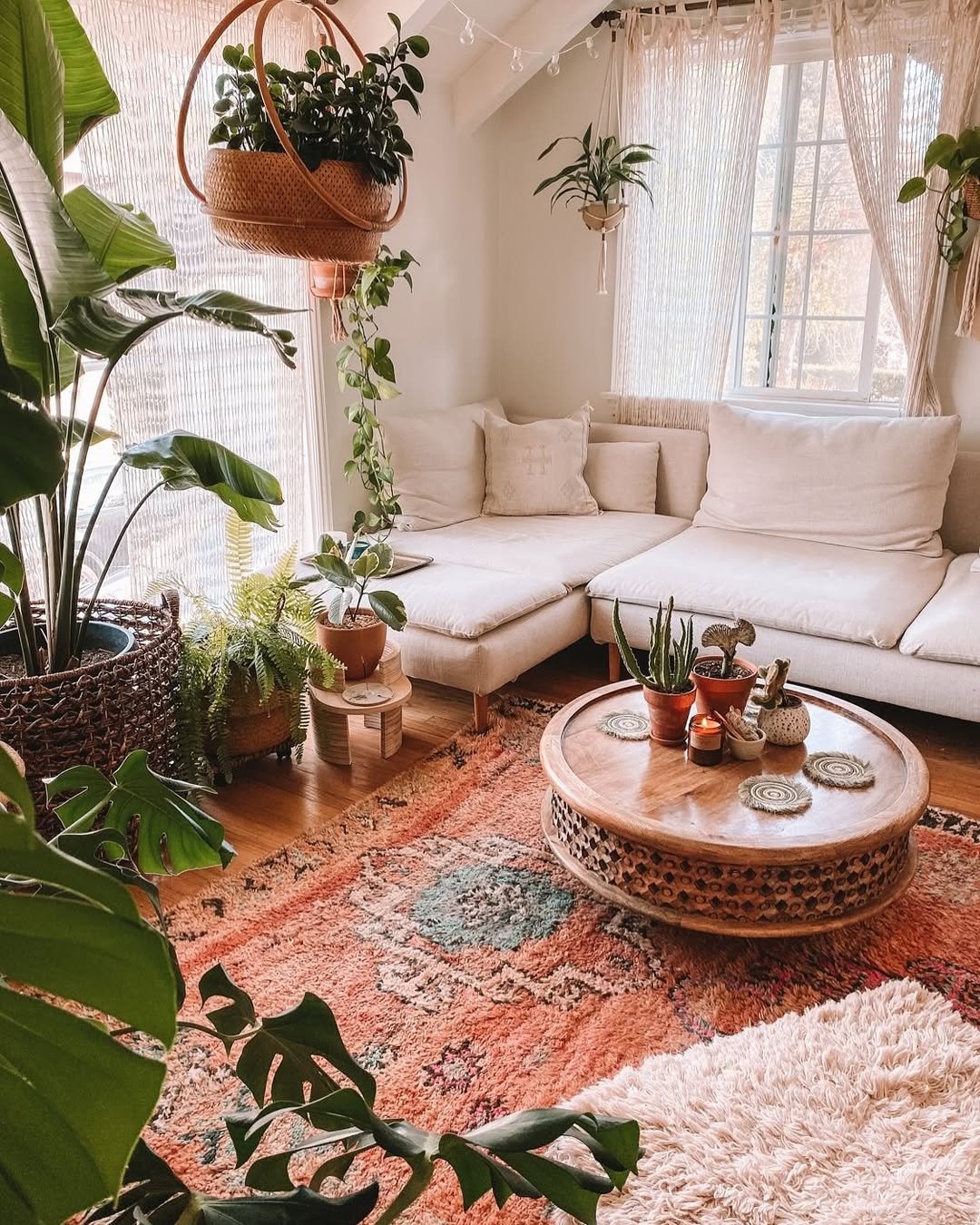 Natural light floods this space, bouncing off soft fabrics and leafy greens. The neutral sofa blends seamlessly with the warm-toned rug, while hanging plants bring in that effortless boho energy that feels fresh and alive.