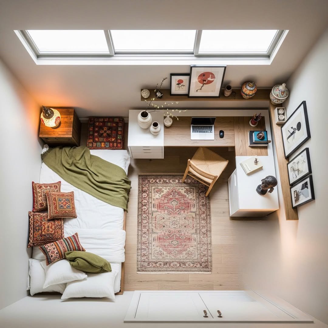 There’s something so satisfying about a small space that feels completely thought through. The low bed, tucked neatly under the skylight, creates this cozy, almost cocoon-like corner, while the patterned rug and layered cushions bring in that earthy richness.