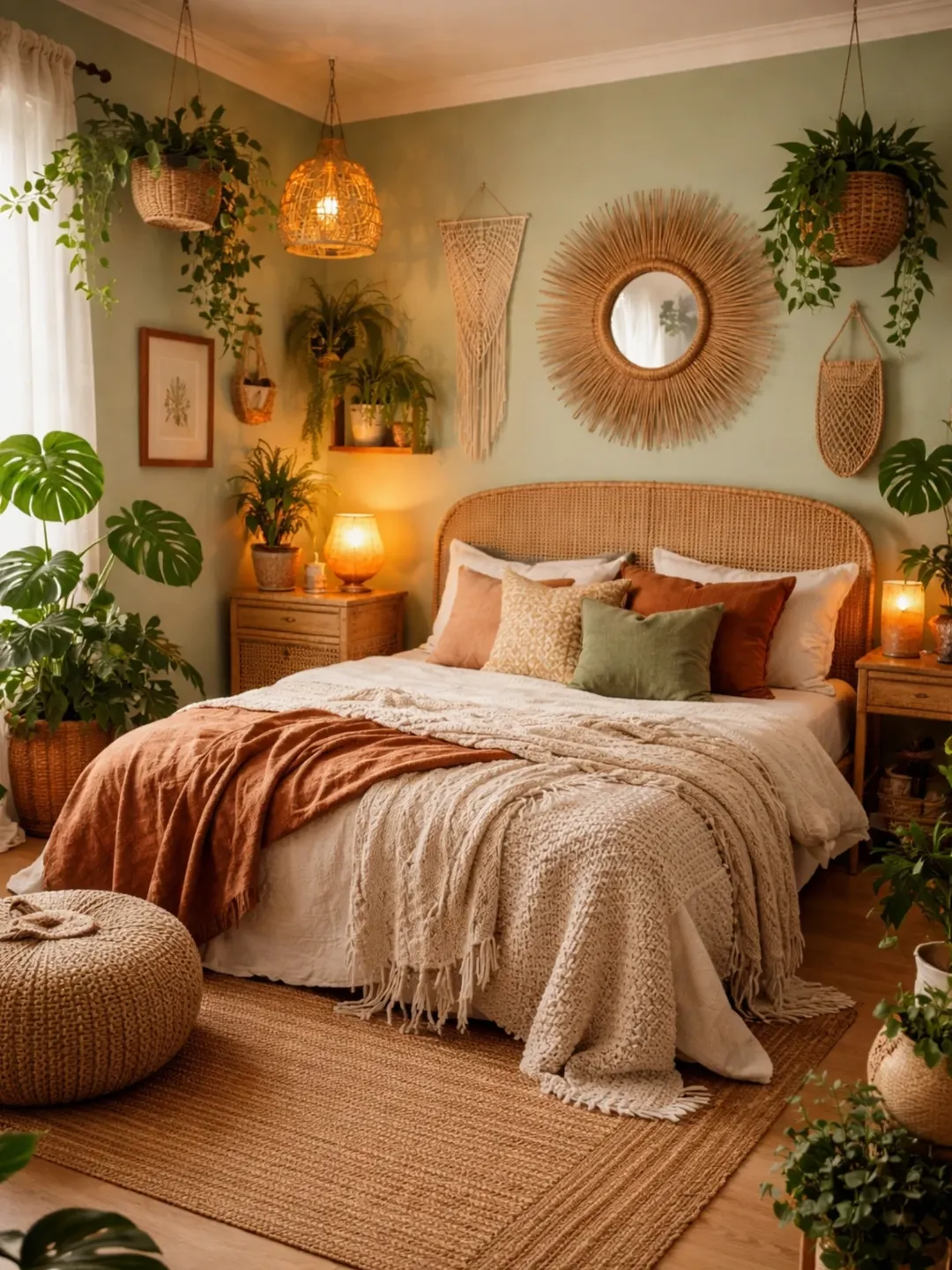 This space leans into that lush, collected energy that makes earthy decor feel alive. Sage walls, woven textures, and trailing plants wrap the room in a soft, natural embrace.